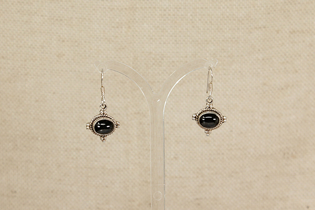 These pretty ’Suarti’-style Silver and dropper earrings are beautifully handcrafted, featuring oval cabochon Black Star Diopside stones framed by intricate silverwork with delicate silver ball detailing around the edge.