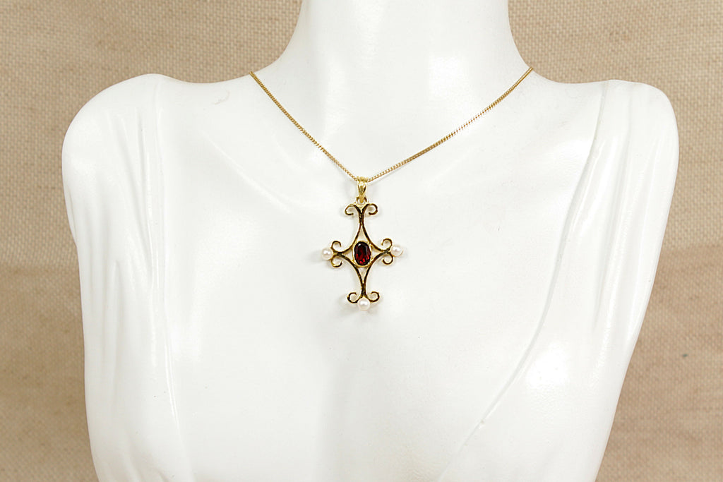 An elegant Silver Gilt Lavaliere Victorian-style pendant and chain, beautifully crafted with timeless charm. The pendant features a central bezel-set faceted garnet that glows with rich, deep red tones. Extending from the centre is a graceful cross design oriented east–west and south, each arm adorned with a lustrous faux pearl at its tip, adding a delicate vintage touch.