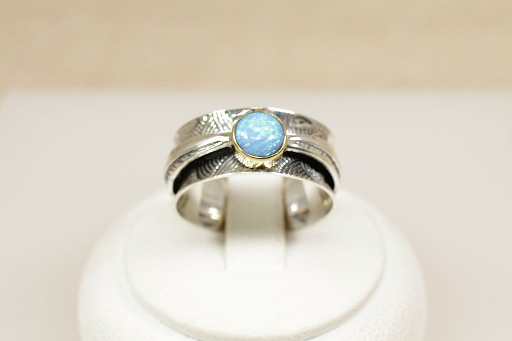 A striking contemporary sterling silver ring featuring a round cabochon Opal gemstone set within a sleek bezel setting. The Opal sits atop a silver band that is nature inspired with a fan or leaf design which rotates freely around a wider, solid silver base band that also has fine silverwork detailing.