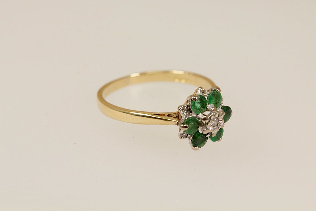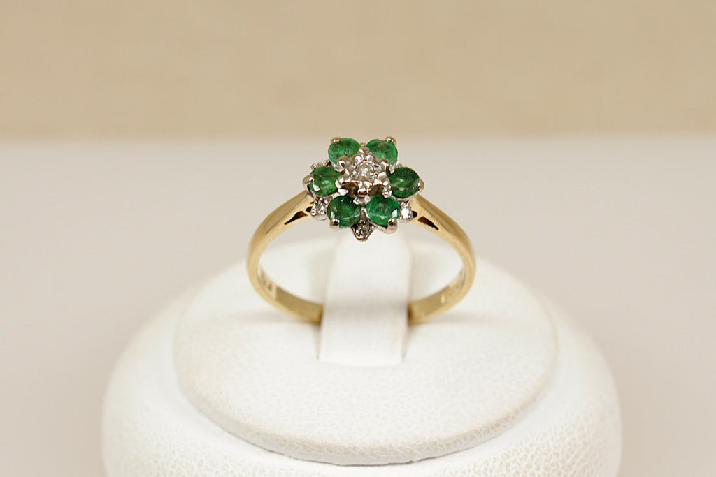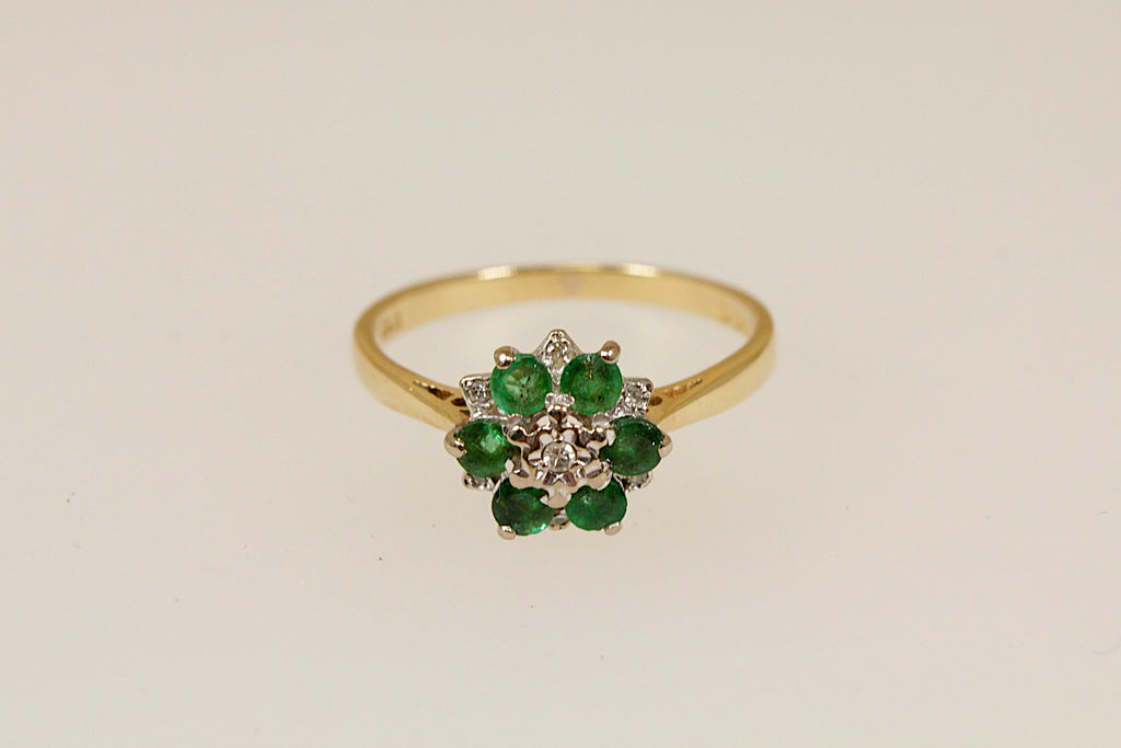 This charming and finely crafted Vintage 18ct Gold ring features a classic ‘daisy’ cluster design. Six round, claw-set Emeralds (approximately 5 points each) form a delicate flower and in between the emeralds are 6 Diamond accents. In the centre is a sparkling 1-point Diamond. All stones are beautifully arranged in a traditional basket setting, allowing light to enhance their colour and brilliance.