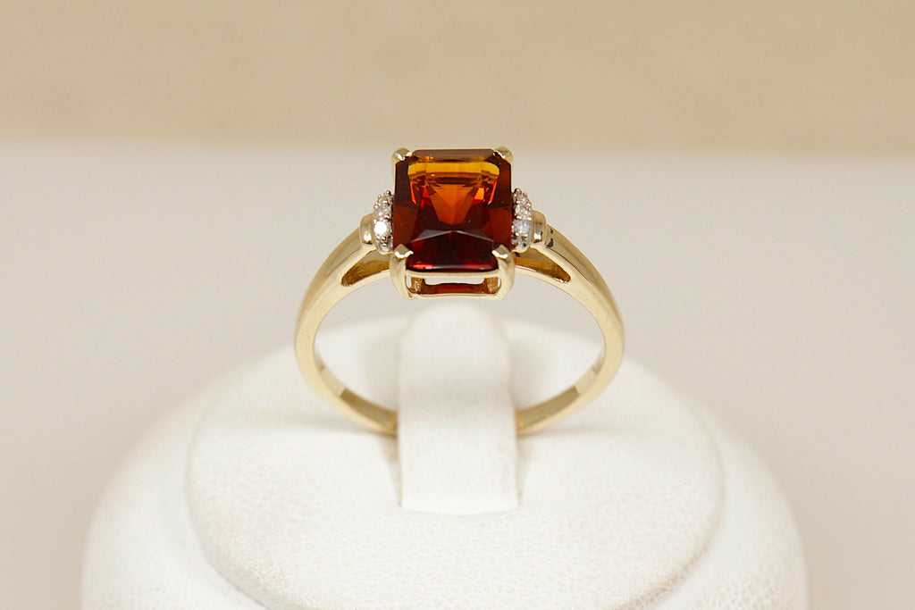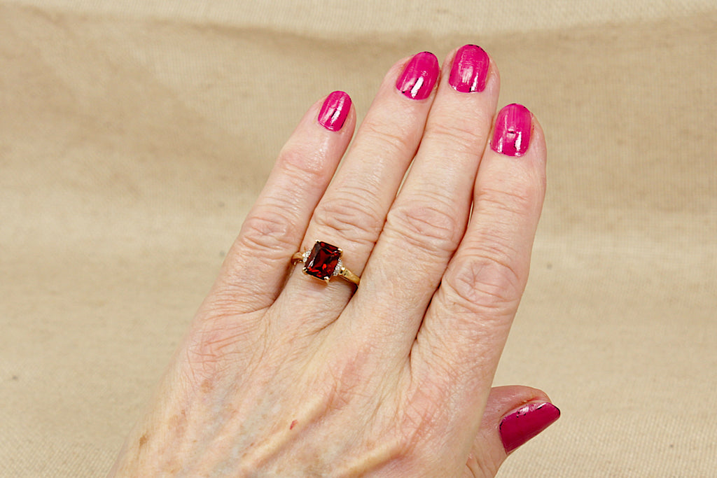 This elegant and eye-catching 9ct Gold ring features a richly coloured rectangular (emerald-cut) Almandine Garnet, securely held in a bold four-claw basket setting that beautifully showcases the gemstone. Enhancing the design, each shoulder is accented with three 1-point Diamonds, adding subtle sparkle and balance to the piece.