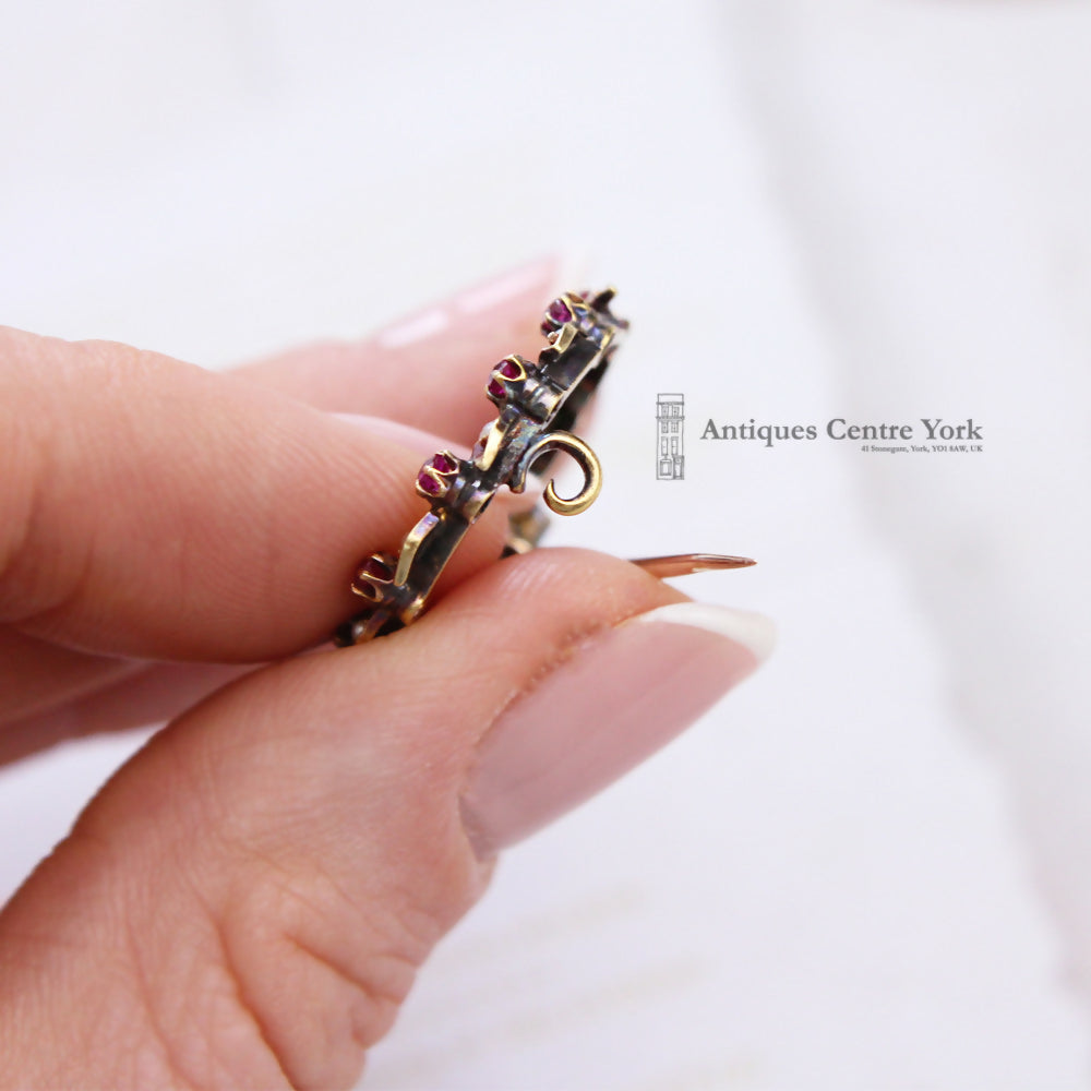 Antique brooch in the shape of a wreath measuring 24mm in diameter and set with alternate small round rubies and pairs of seed pearls (in petals). Mounted in all yellow metal testing as 15ct gold and having a hinge pin and 'C' catch. Gross weight 3.1g.