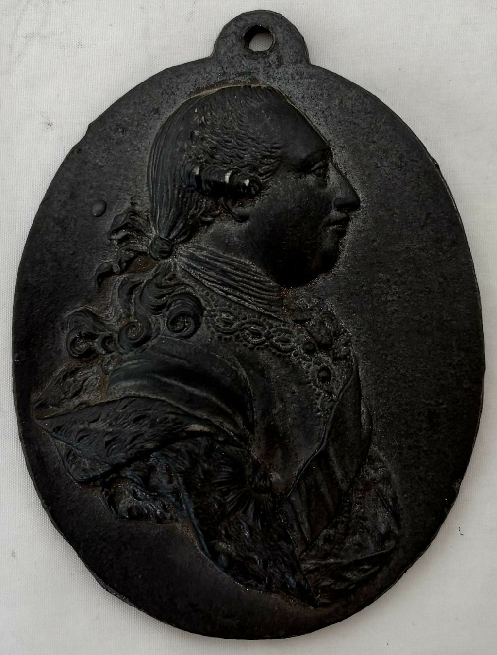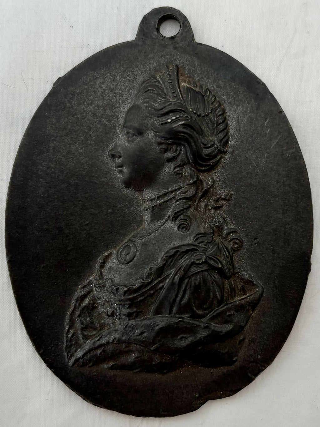 In good condition with a small loss to the outer edge at the base of the Queen Charlotte plaque.