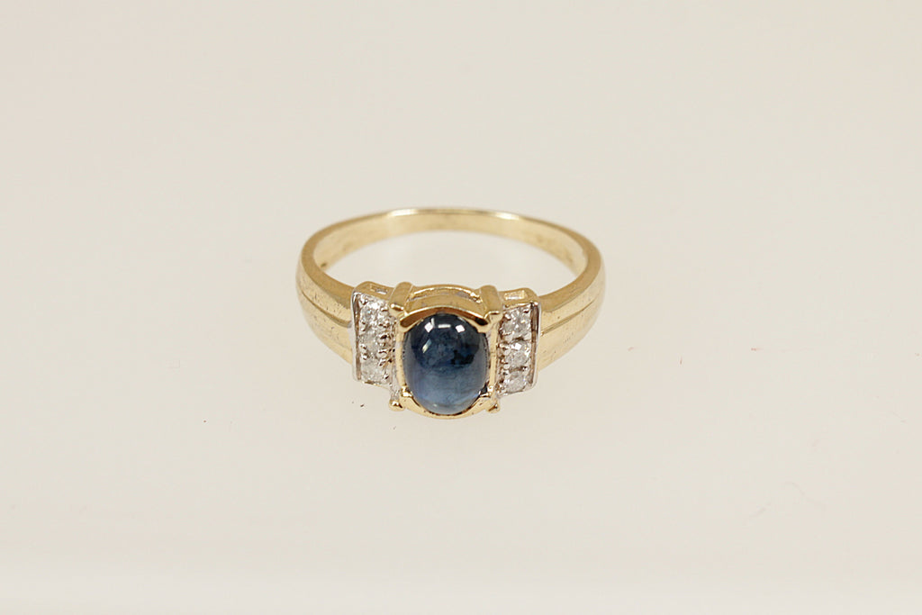 A beautiful 9ct Gold Sapphire and Diamond ring, featuring a stunning oval cabochon-cut cornflower Blue Sapphire of approximately 0.75 carats.