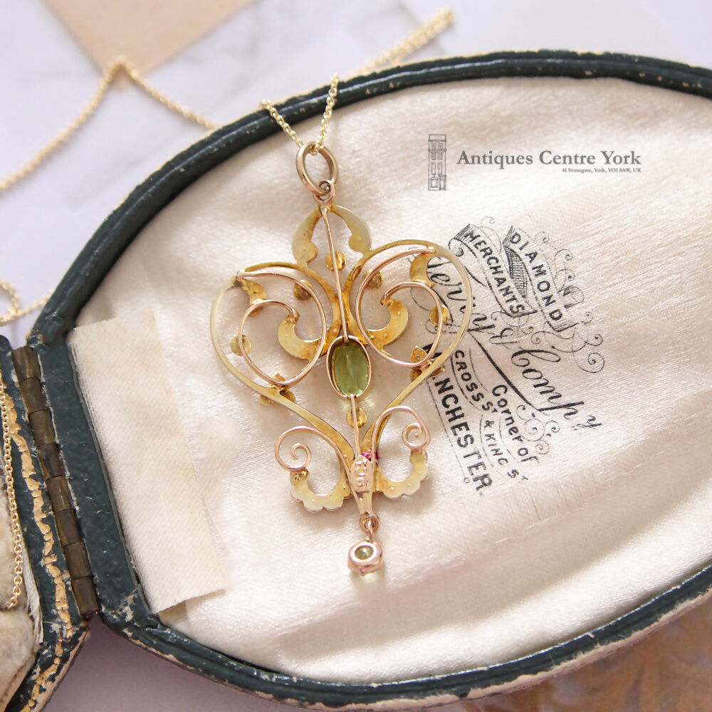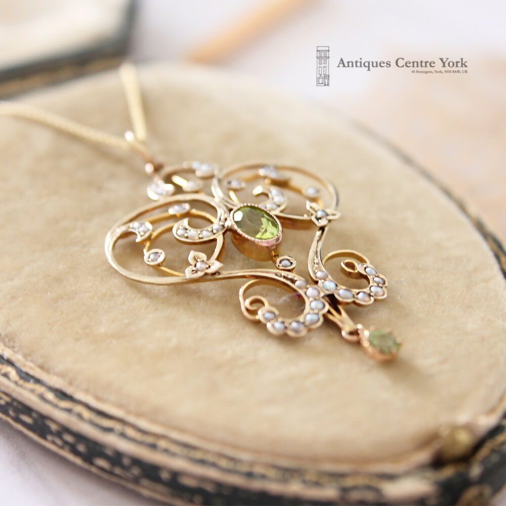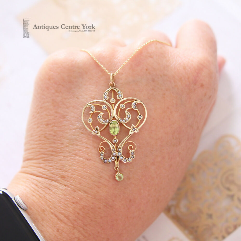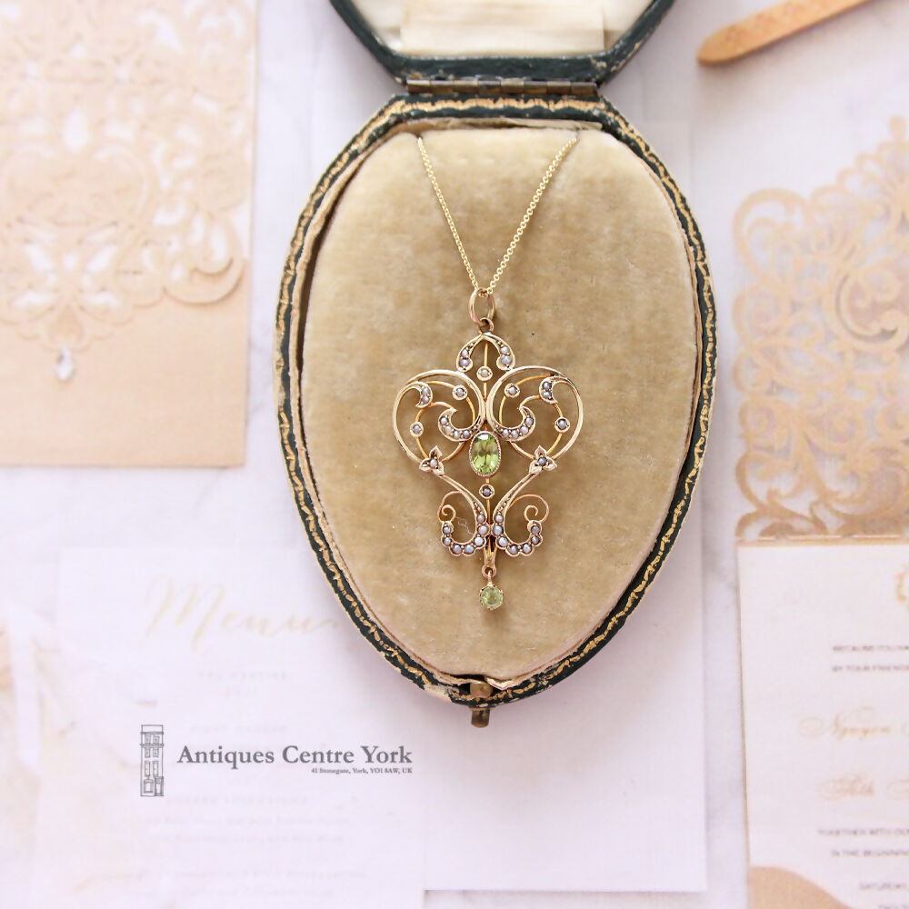 Art Nouveau Edwardian pendant set with a central oval mixed cut peridot in a 9ct gold frame being set with seed pearls in a swirl design with a round peridot measuring 3.9mm suspended from the bottom. Measuring 30mm x 49mm. Stamped 9ct on back and tested to confirm. Suspended from a modern 16" 9ct gold trace chain. Gross weight 4.1g.