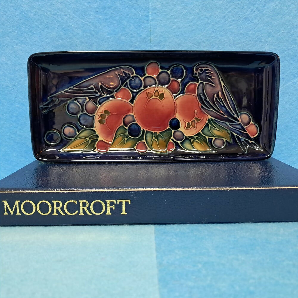 A vintage Moorcroft pen tray in the Finches design by Sally Tuffin.