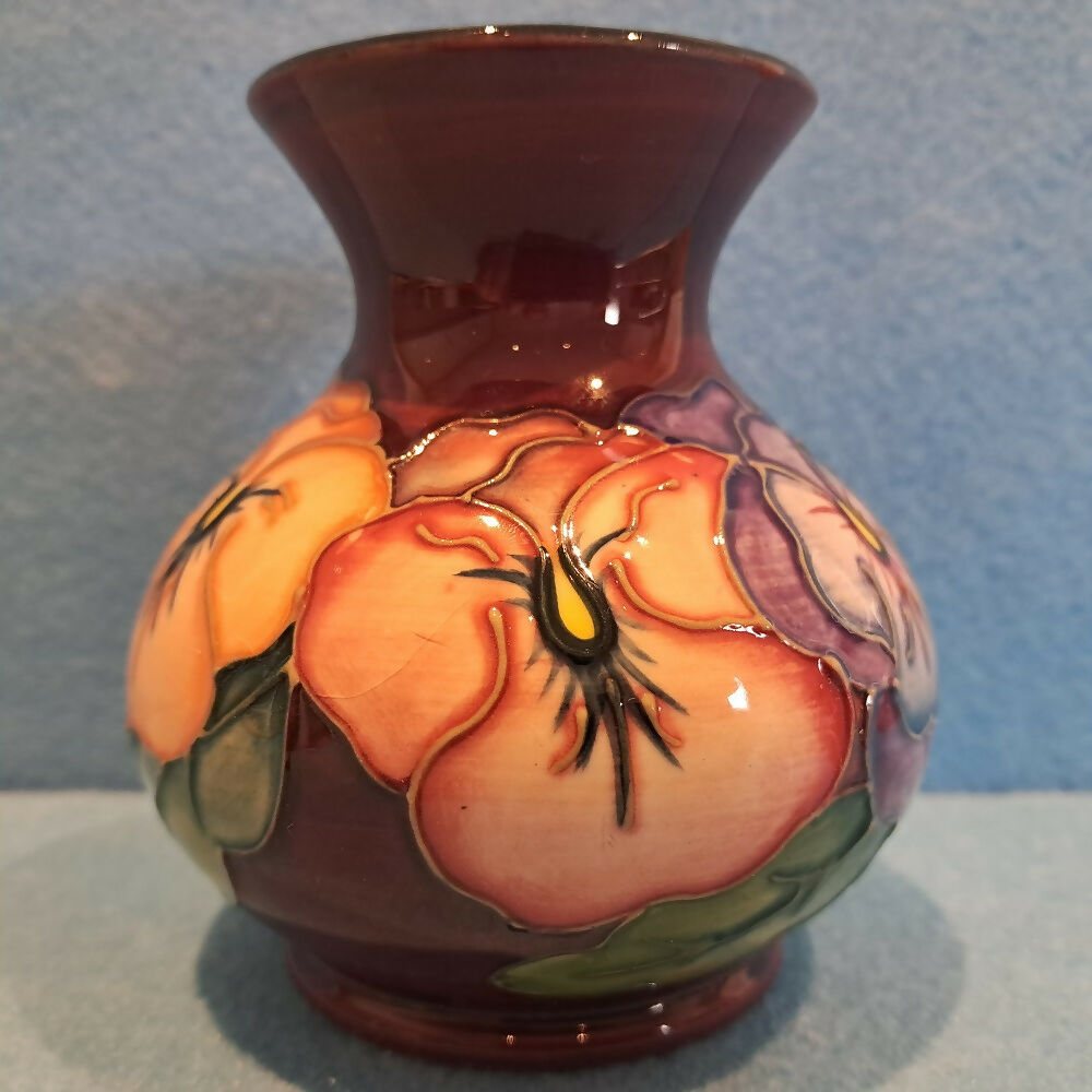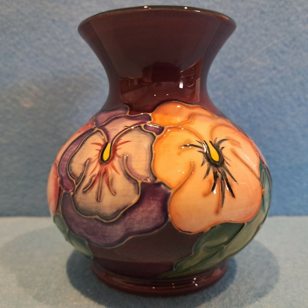 A vintage Moorcroft vase in the Pansy design by Rachel Bishop.