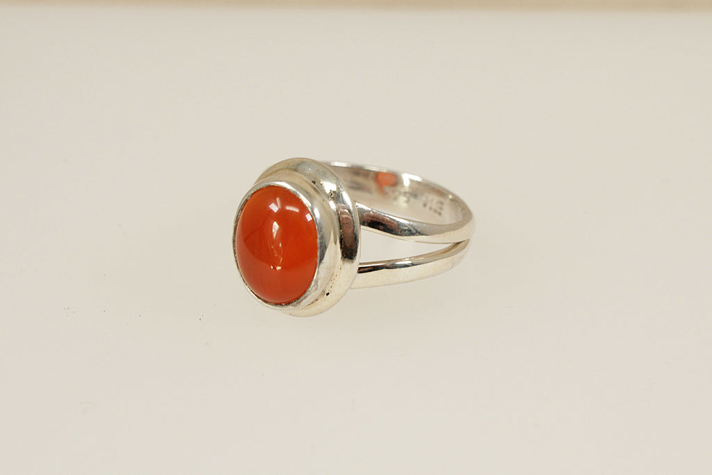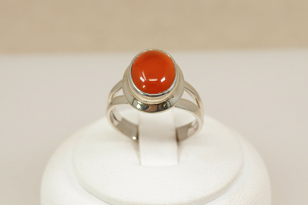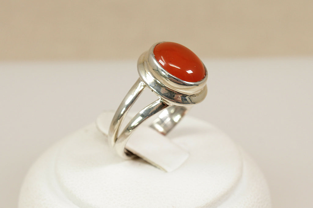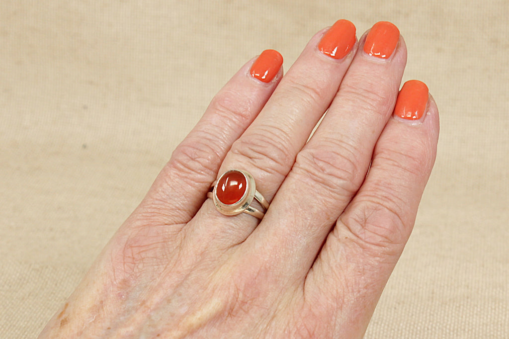 This stylish vintage silver ring has an oval cabochon Carnelian set in an elegant decorative silver setting.