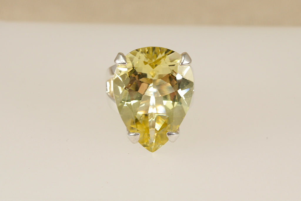 This spectacular Sterling Silver Lemon Citrine ring features a huge pear-shaped faceted lemon Citrine, estimated at approximately 23 carats, with exceptional sparkle and brilliance.