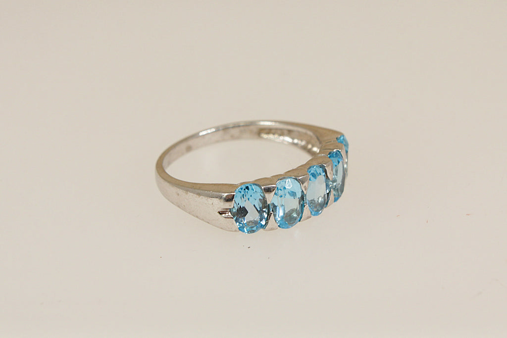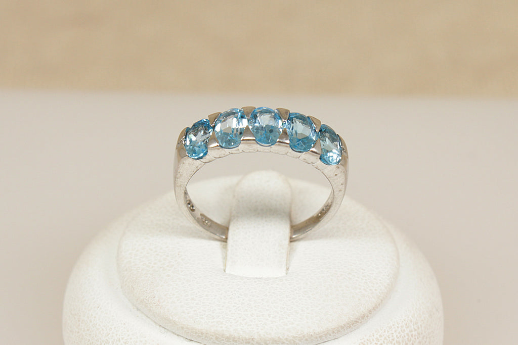 This beautifully crafted Sterling Silver ring features five sparkling oval Blue Topaz stones, each half bezel-set across a smooth, substantial band. The rich blue of the topaz stones catches the light brilliantly, while the chunky band gives the piece a bold and luxurious feel.