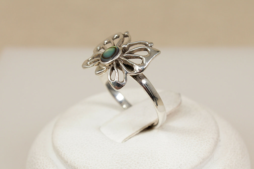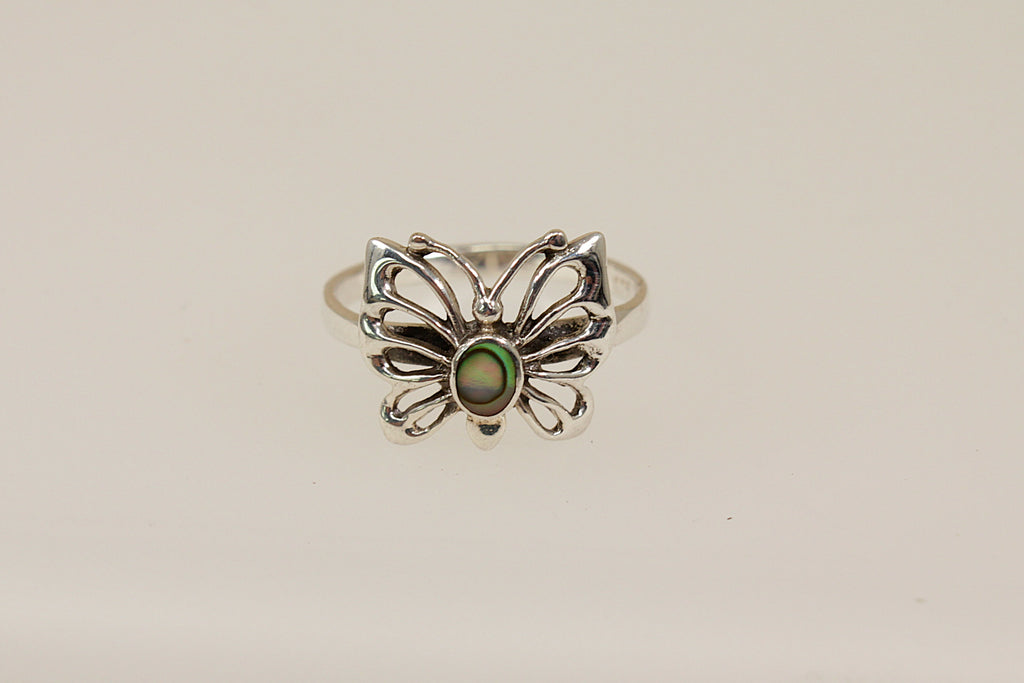 This delightful Silver ring is beautifully crafted in the form of a butterfly, symbolising transformation and beauty. The butterfly’s body features an oval Abalone shell, displaying shimmering iridescent hues of blue, green, and purple that catch the light with every movement.