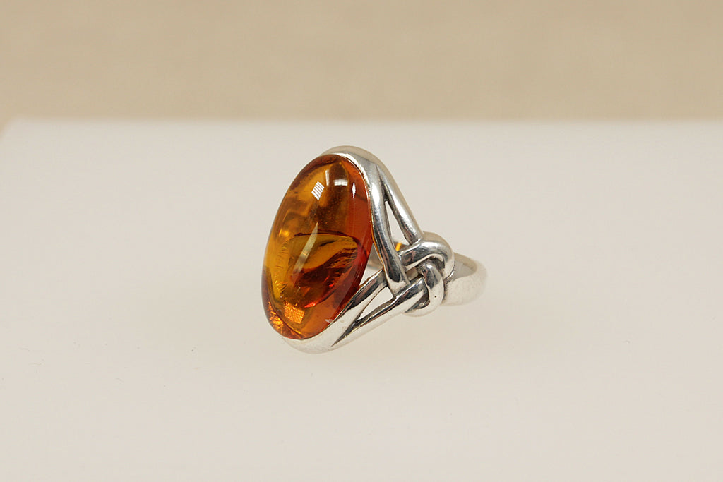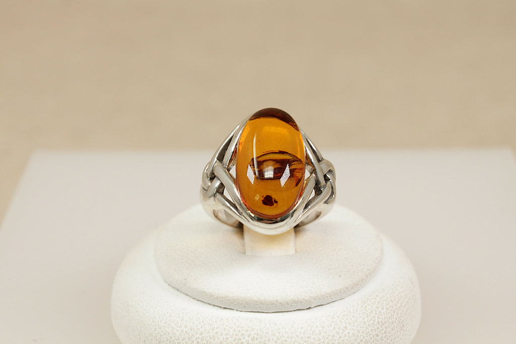 A bold Silver Celtic designer statement ring featuring a large oval cabochon Amber stone. The amber is bezel set, showcasing its rich, warm tones and natural inclusions.