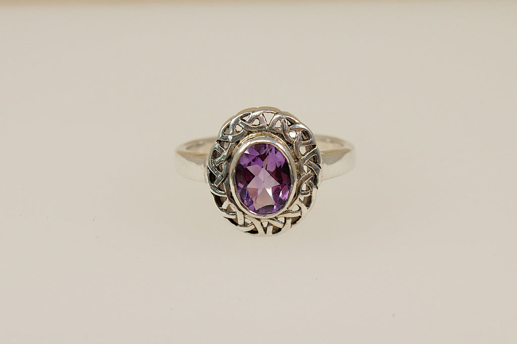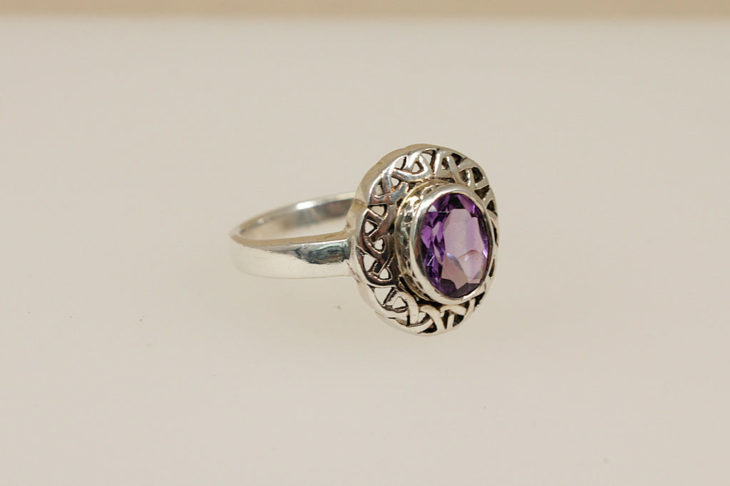 This elegant Silver ring features a beautiful oval faceted Amethyst at its centre, radiating rich purple tones with lovely clarity and sparkle. Surrounding the gemstone is an intricate Celtic knot design, symbolising unity, eternity, and connection — adding depth and meaning to its graceful form.