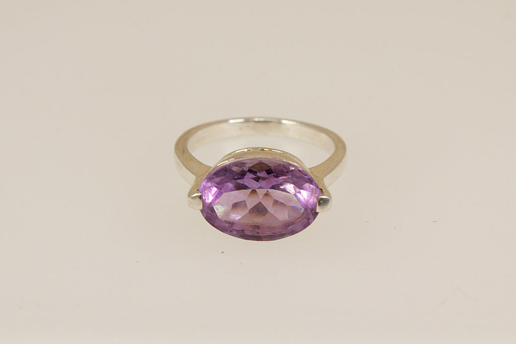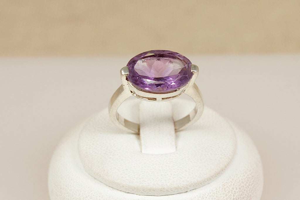 This striking Sterling Silver ring features a large oval faceted Amethyst, showcased in a bold statement solitaire design. The gemstone is secured by two chunky claws at each end of the elegant elliptical setting, which flows seamlessly down the shoulders into a smooth band.