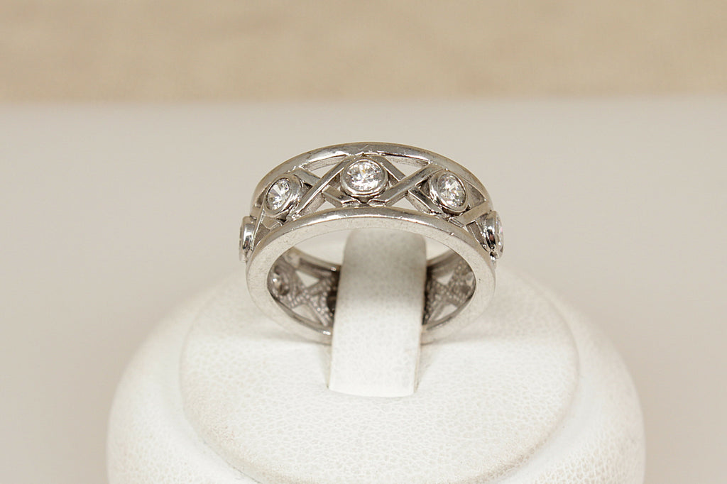 This elegant Sterling Silver eternity ring features a bold openwork design with round, bezel-set sparkling cubic zirconia stones alternating with an attractive “X” motif. Finely crafted with a broad band for a comfortable yet statement look, the ring is stamped 925 and CZ inside, confirming its sterling silver quality and stone type. A beautiful piece that adds timeless sparkle to any jewellery collection.