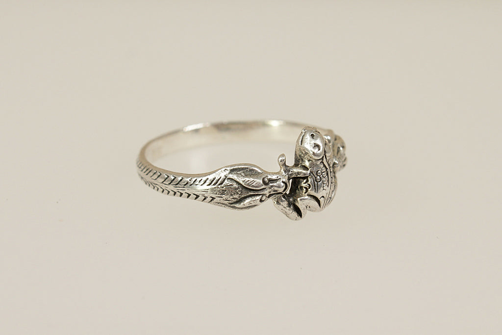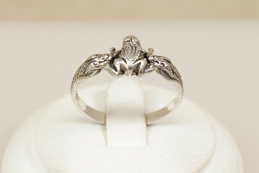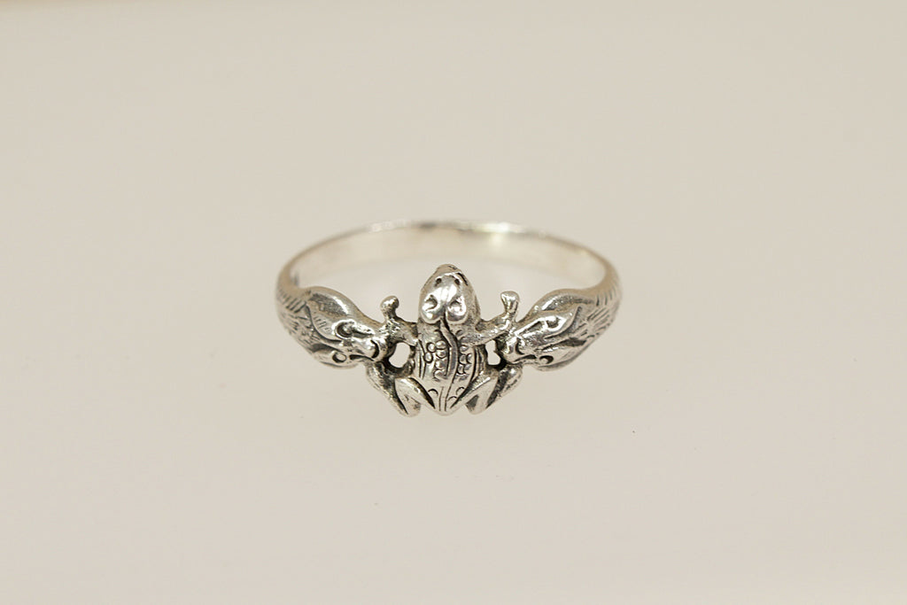A finely handcrafted Silver ring featuring a central frog motif flanked by snake heads on each side.