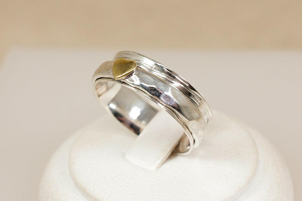 The ring is fitted with a hammered Silver spinner band, which moves freely around the main band. Set onto the spinner is a smooth gold-coloured heart, creating a beautiful mixed-metal contrast and a romantic focal point.