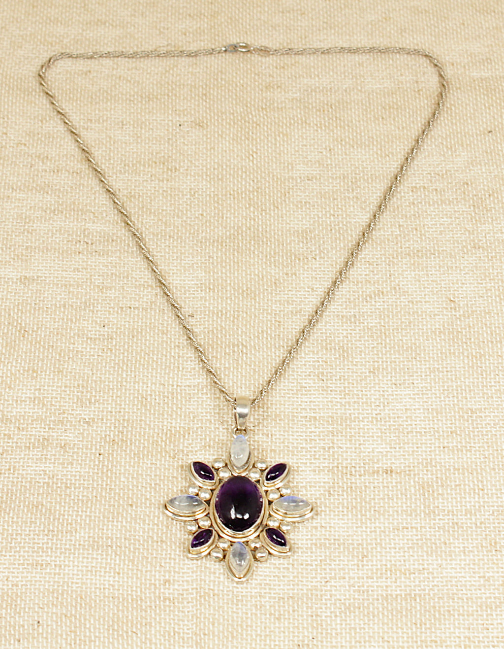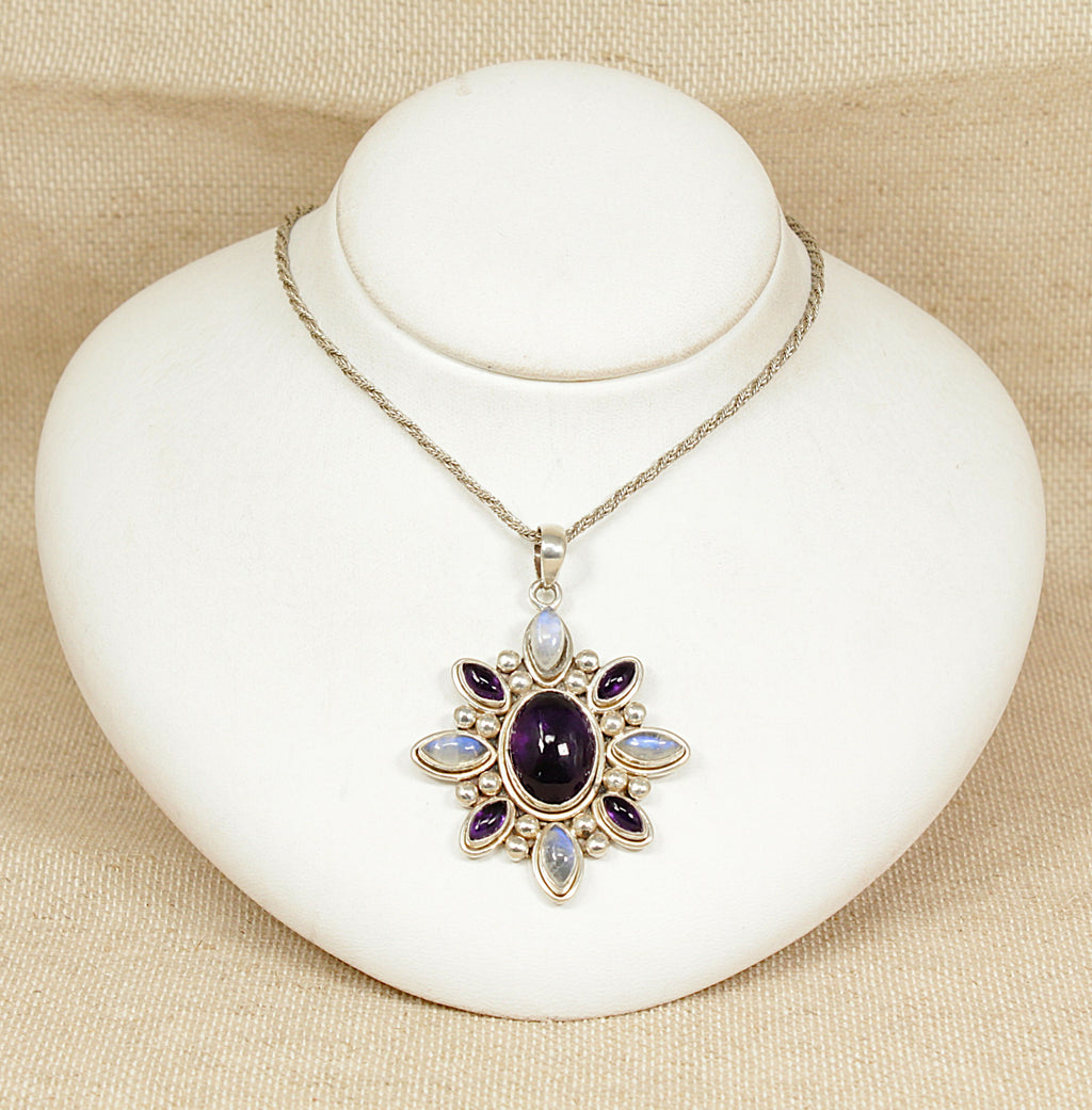 This impressive Sterling Silver pendant showcases a striking oval bezel-set Amethyst at its centre. Surrounding it are eight alternating marquise-cut Moonstones and Amethysts, arranged like petals in a radiant floral design. Each gemstone is set in a raised bezel, accented with delicate silver ball detailing between the petals for added texture and craftsmanship.