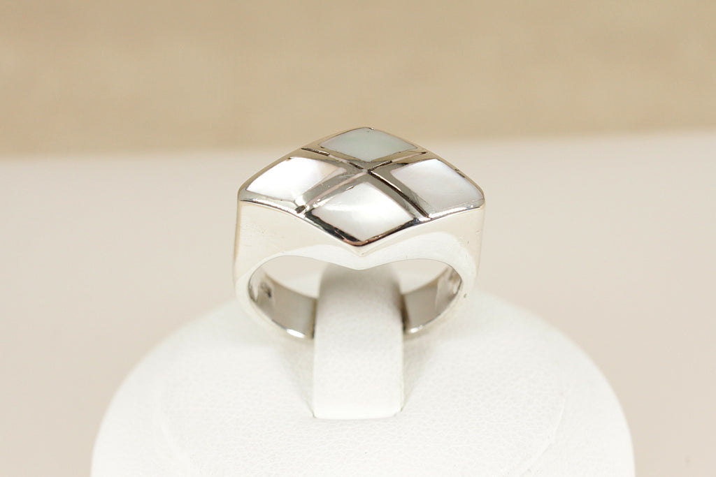 The ring features a diamond-shaped head inlaid with four diamond-shaped pieces of luminous Mother of Pearl, creating a striking geometric effect with beautiful iridescence.