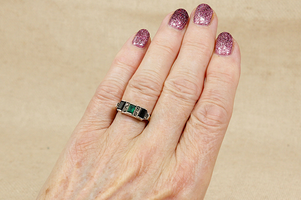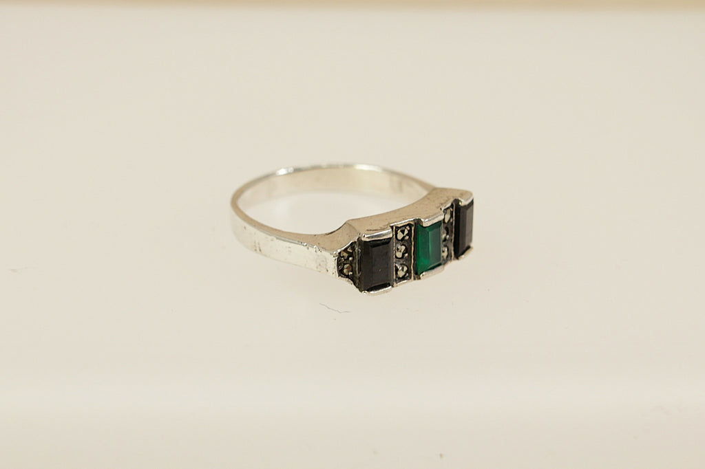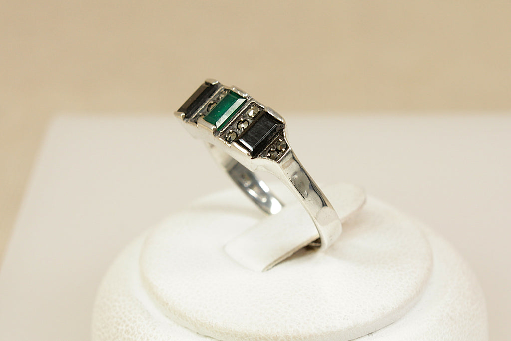 A bold and striking Art Deco style Silver ring featuring a central rectangular faceted Chalcedony stone flanked by matching rectangular Onyx stones on each side. The stones are interspaced with shimmering marcasite accents, all set within an angular, geometric rectangular mount that perfectly captures the elegance of the Art Deco era. Inside the band, it is stamped 925 for sterling silver.