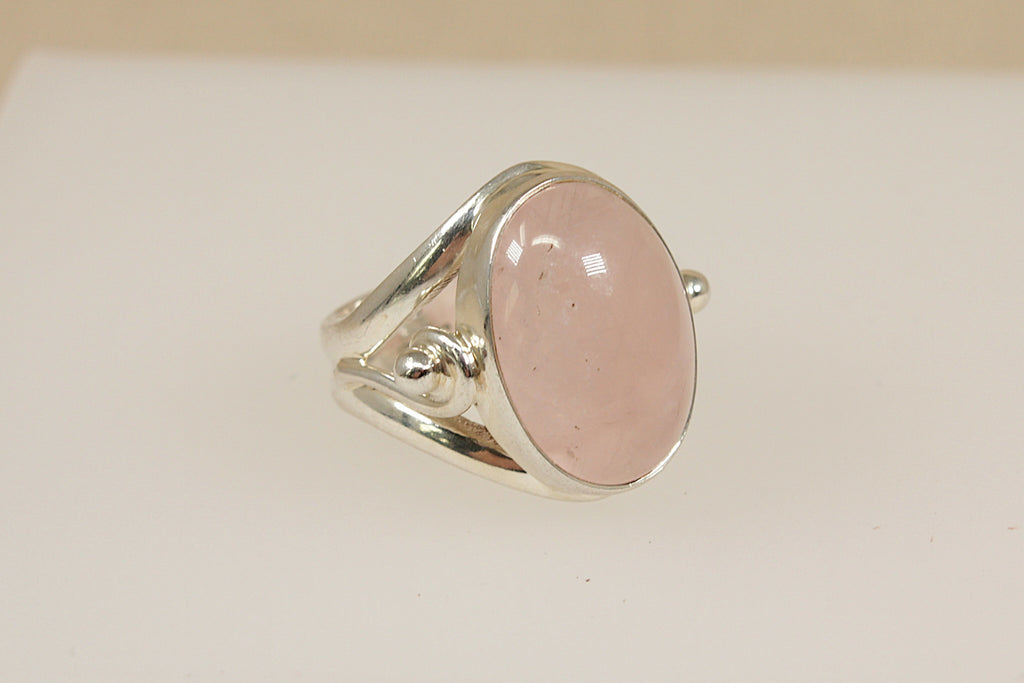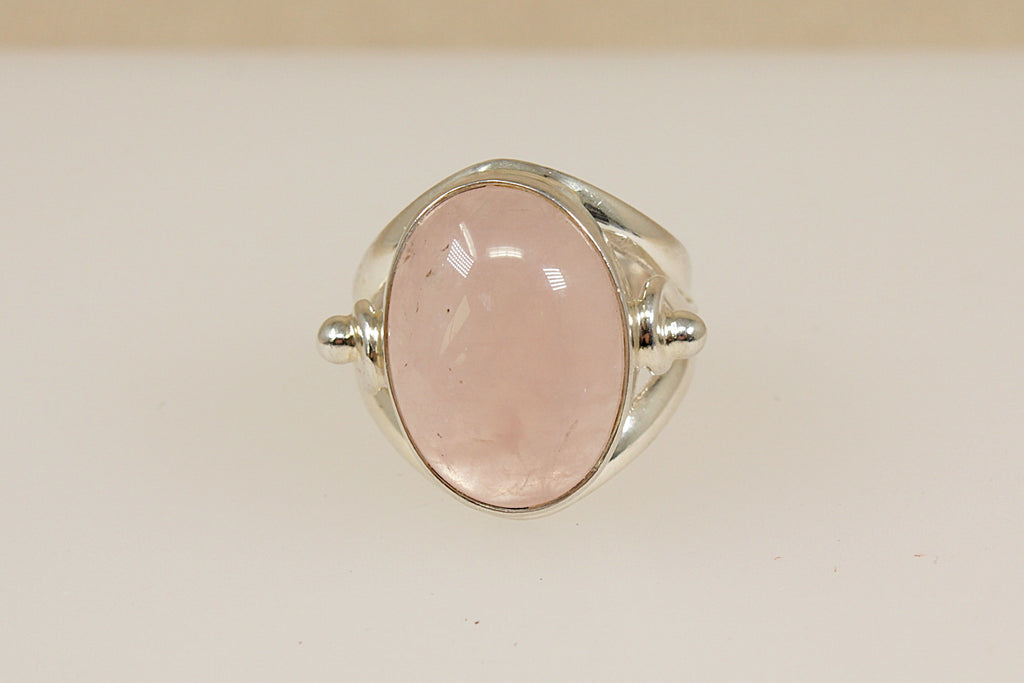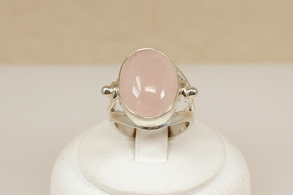 This eye-catching Sterling Silver ring features a large oval cabochon-cut Pink Quartz, securely bezel-set to showcase the stone’s soft blush hue and smooth finish. The stone is framed by ornate openwork shoulders with elegant scroll detailing that flows seamlessly into a smooth silver band.