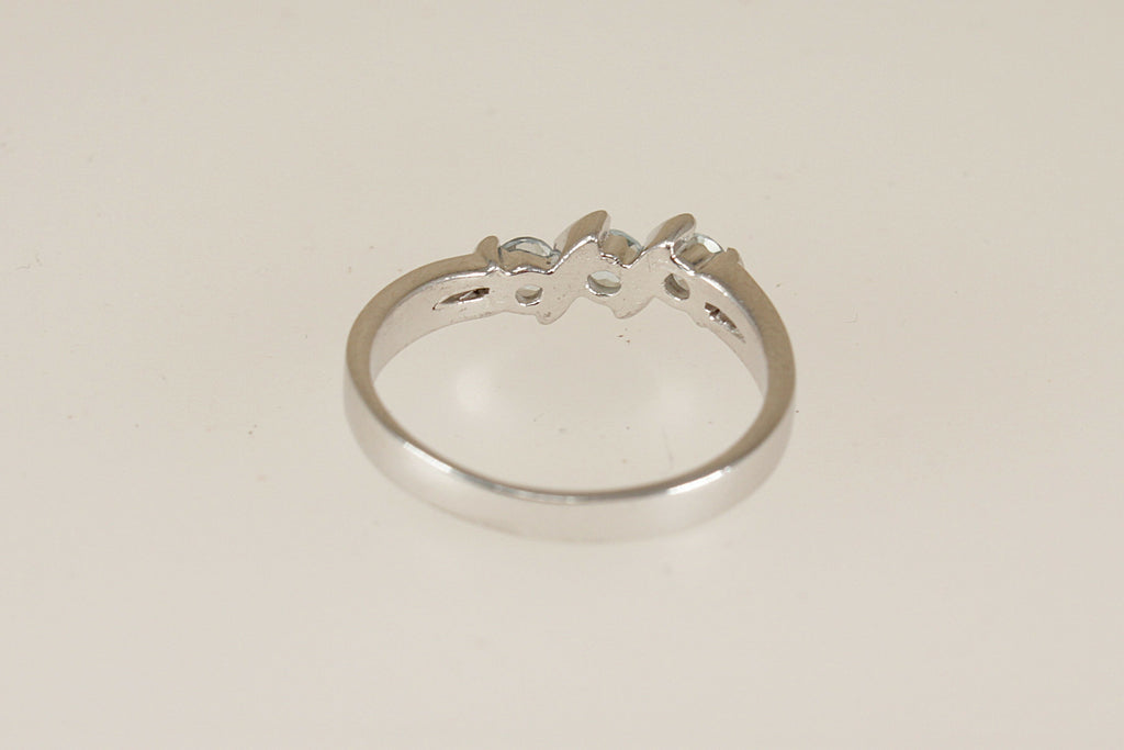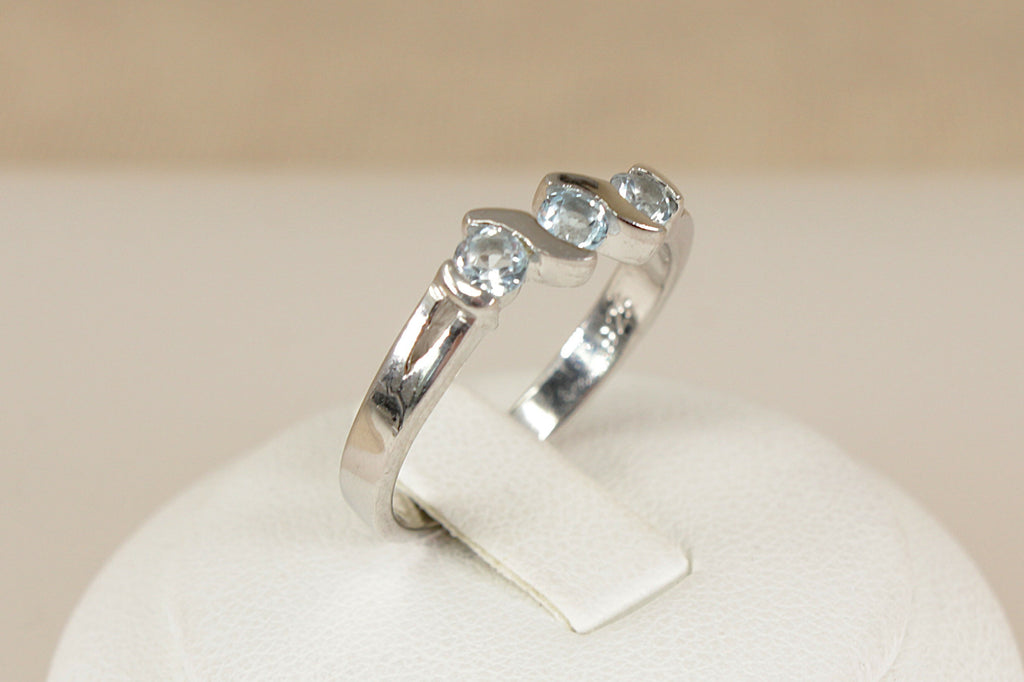This pretty Silver light Blue Topaz trilogy ring is a charming and contemporary design. It features three round faceted blue topaz gemstones, beautifully set in a flowing wave-style silver mount that separates each stone with elegant curves.
