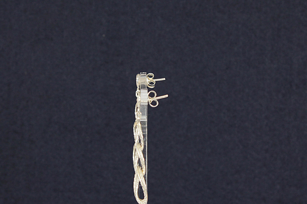 This elegant pair of Silver dropper earrings features three delicately handcrafted hoops, each graduating in size with the smallest positioned at the top. They have a secure stud fastening, the hoops are beautifully detailed around their edges, showcasing fine silversmith craftsmanship. The earrings bear continental silver hallmarks, confirming their quality and authenticity.