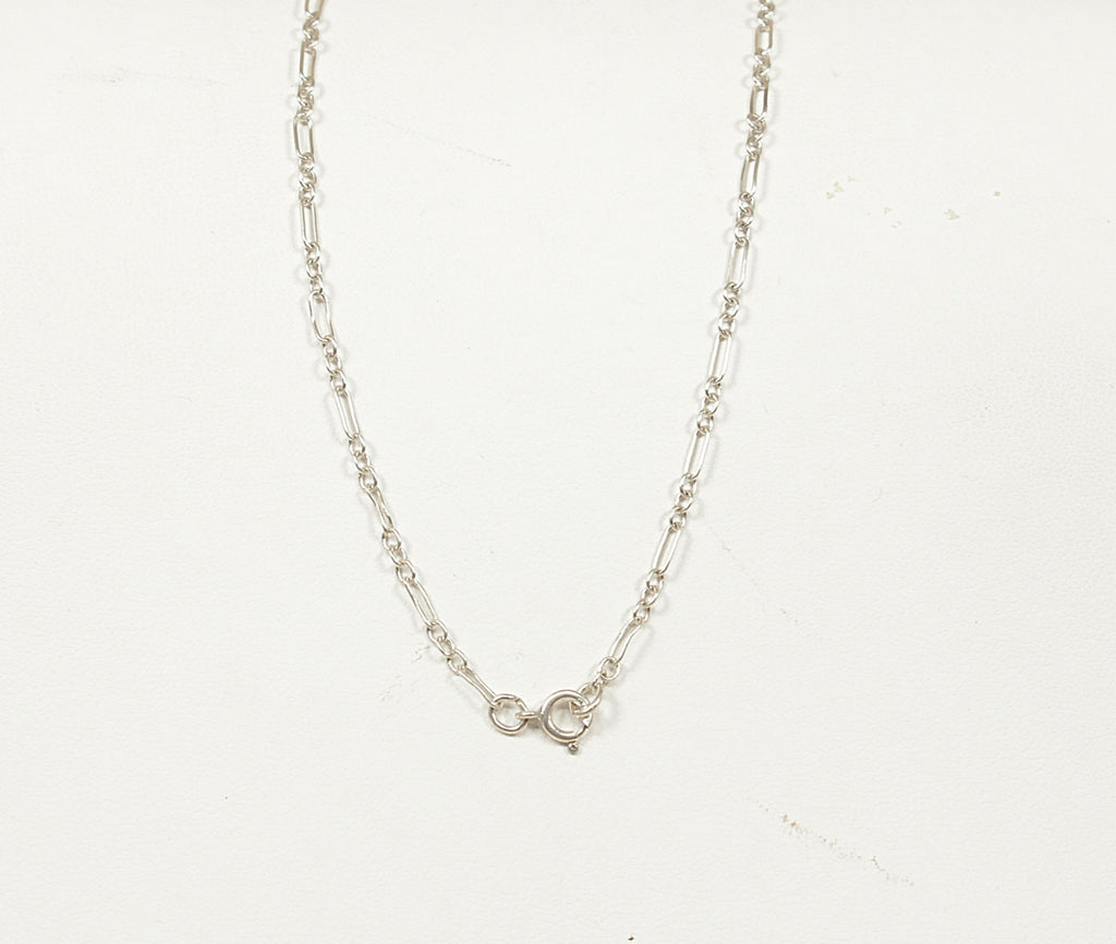 The pendant is accompanied by an 18-inch handmade silver chain, composed of fine rectangular links interspersed with occasional round links, adding subtle texture and interest. The piece is stamped STERLING, confirming its silver quality.