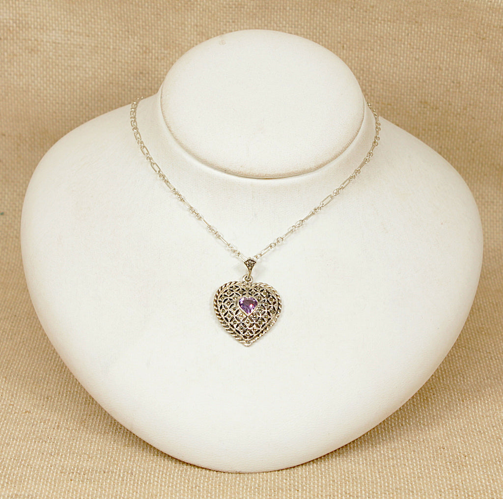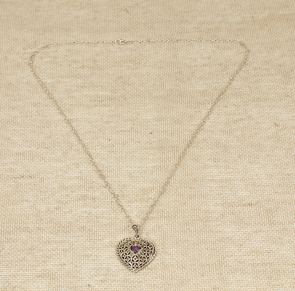 This elegant vintage Silver heart pendant is beautifully handcrafted and features a central heart-shaped Amethyst, securely bezel set as the focal point of the design. Surrounding the gemstone is intricate cut-out silverwork with a delicate scalloped edge, showcasing fine artisanal craftsmanship.