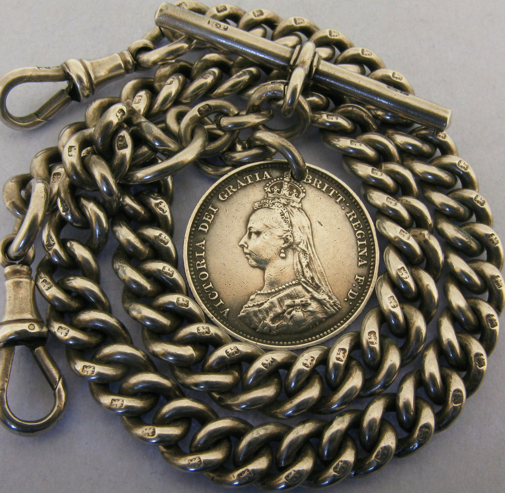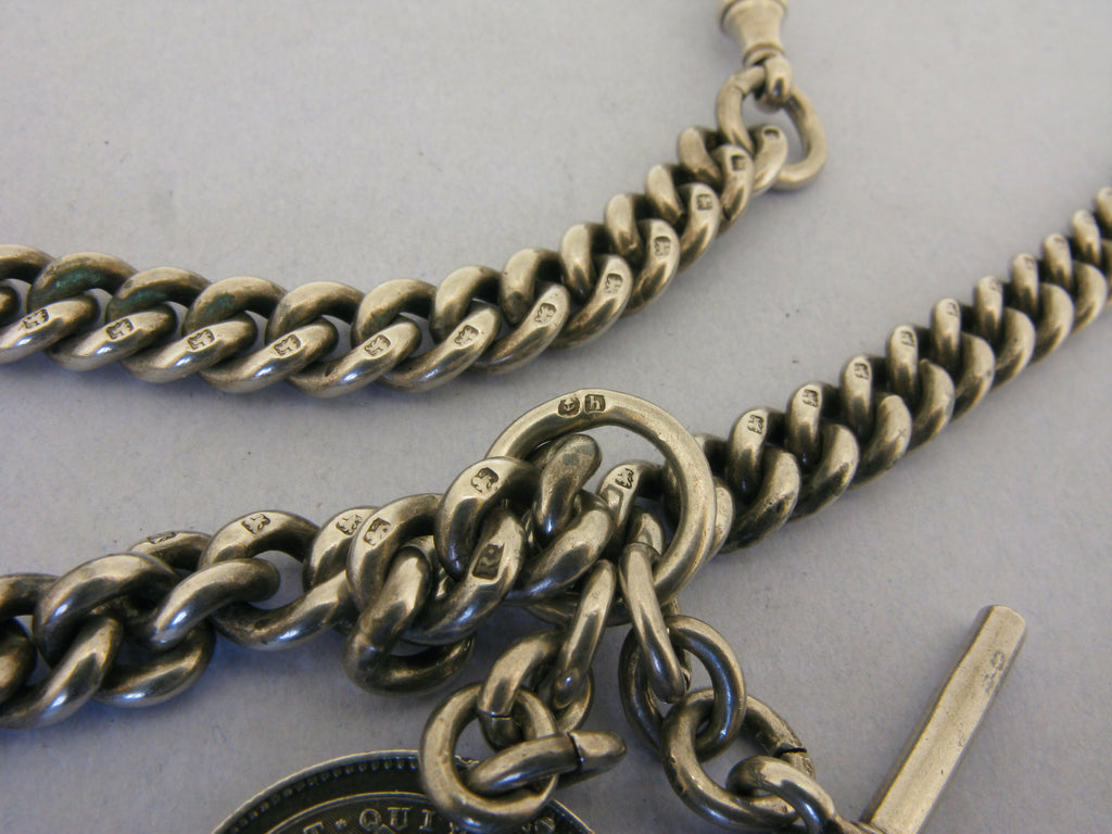 Antique Solid Silver Double Albert Watch Chain T-Bar & Coin Fob Bir 1907