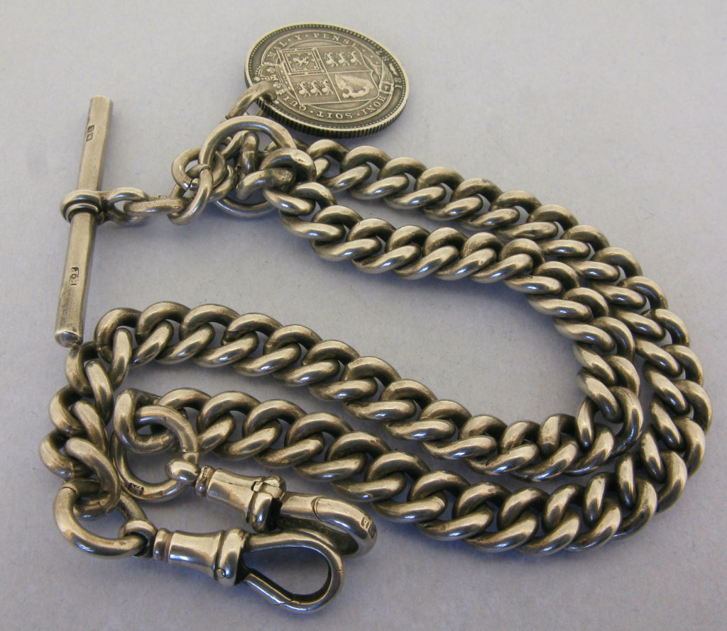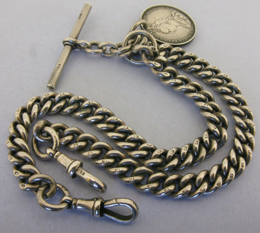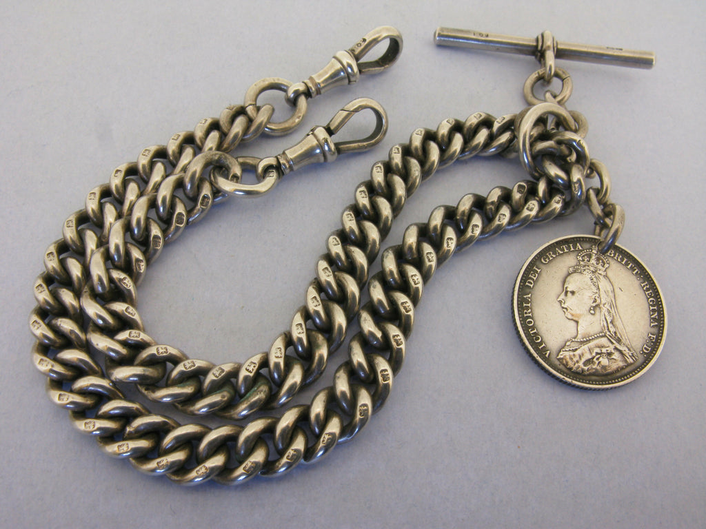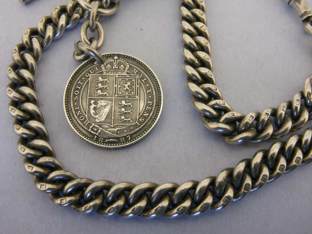 This one is an antique sterling silver double Albert pocket watch chain with curb links, a t-bar, fob and working dog catches. Each link of the chain is hallmarked with the lion passant sterling silver mark. The bulls eye link is hallmarked Birmingham 1907. Both dog catches work well and close tightly shut. Both dog catches are hallmarked for sterling silver Birmingham 1907 with the maker’s mark RP. The hallmark on the t-bar is also for sterling silver Birmingham 1907 maker’s mark RP. The fob is a sterling silver 1887 one shilling coin. Weighs in at 69.3 grams approx. Measurements: 13 & ¾ inches long approx. Plus the extra links of chain attached to the fob and t-bar. Condition: In excellent condition.