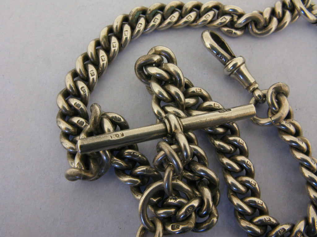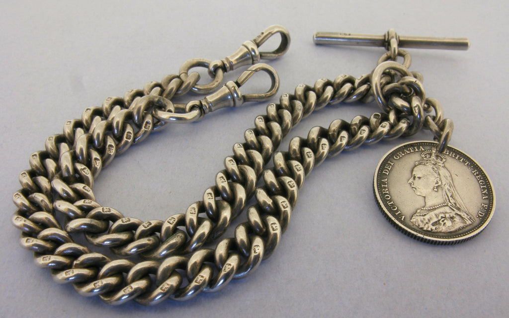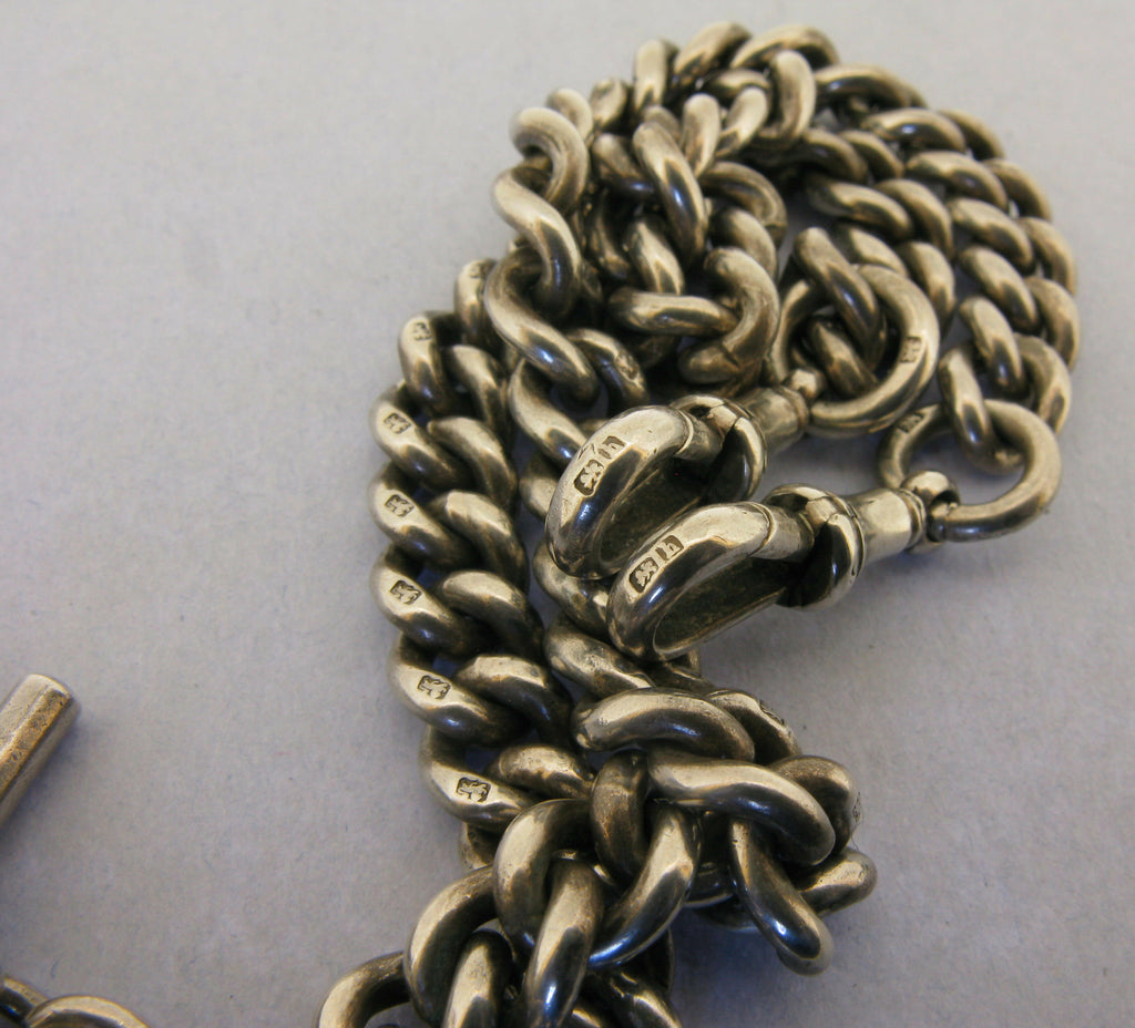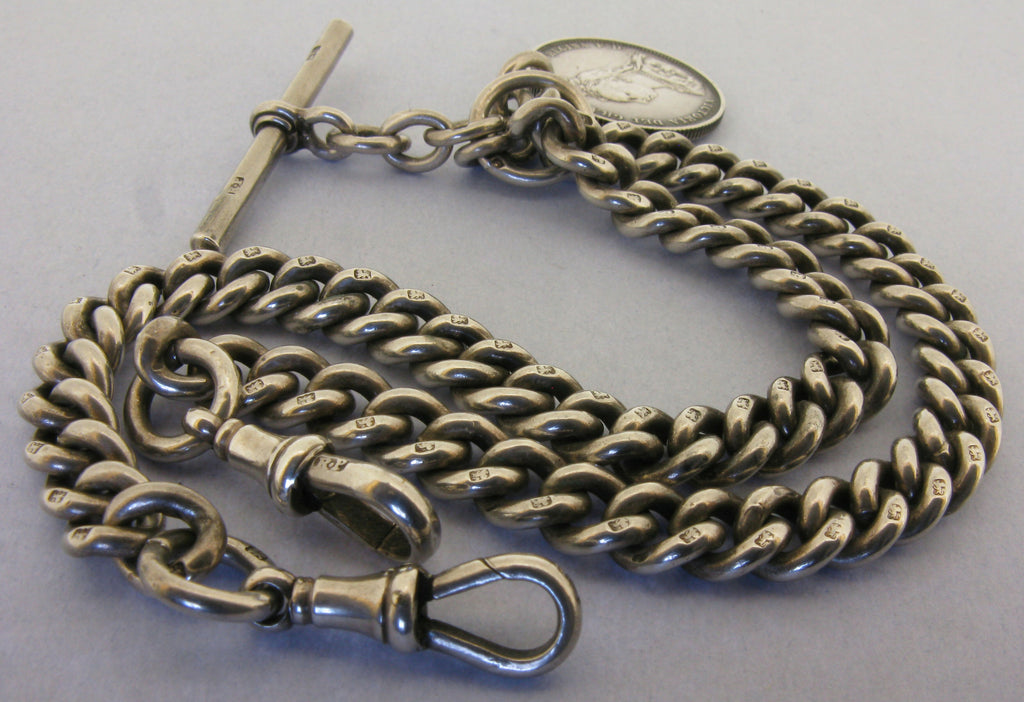 This one is an antique sterling silver double Albert pocket watch chain with curb links, a t-bar, fob and working dog catches. Each link of the chain is hallmarked with the lion passant sterling silver mark. The bulls eye link is hallmarked Birmingham 1907. Both dog catches work well and close tightly shut. Both dog catches are hallmarked for sterling silver Birmingham 1907 with the maker’s mark RP. The hallmark on the t-bar is also for sterling silver Birmingham 1907 maker’s mark RP. The fob is a sterling silver 1887 one shilling coin. Weighs in at 69.3 grams approx. Measurements: 13 & ¾ inches long approx. Plus the extra links of chain attached to the fob and t-bar. Condition: In excellent condition.