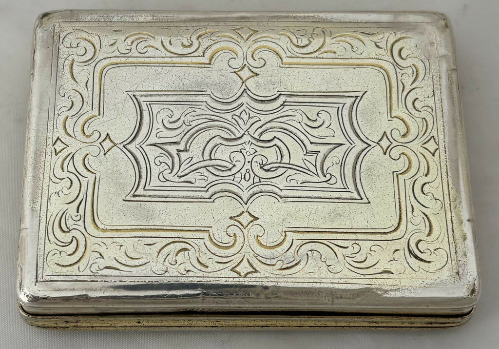 The box sits well on a level surface and the lid closes securely. The decoration is softened, especially on the lid border. The base with wrinkles from construction and the underside with softened decoration and worn gilding. Corners with pin dents. Fine marks and scratches commensurate with age and use. Gilt interior in good order, but wear to the gilt exterior.