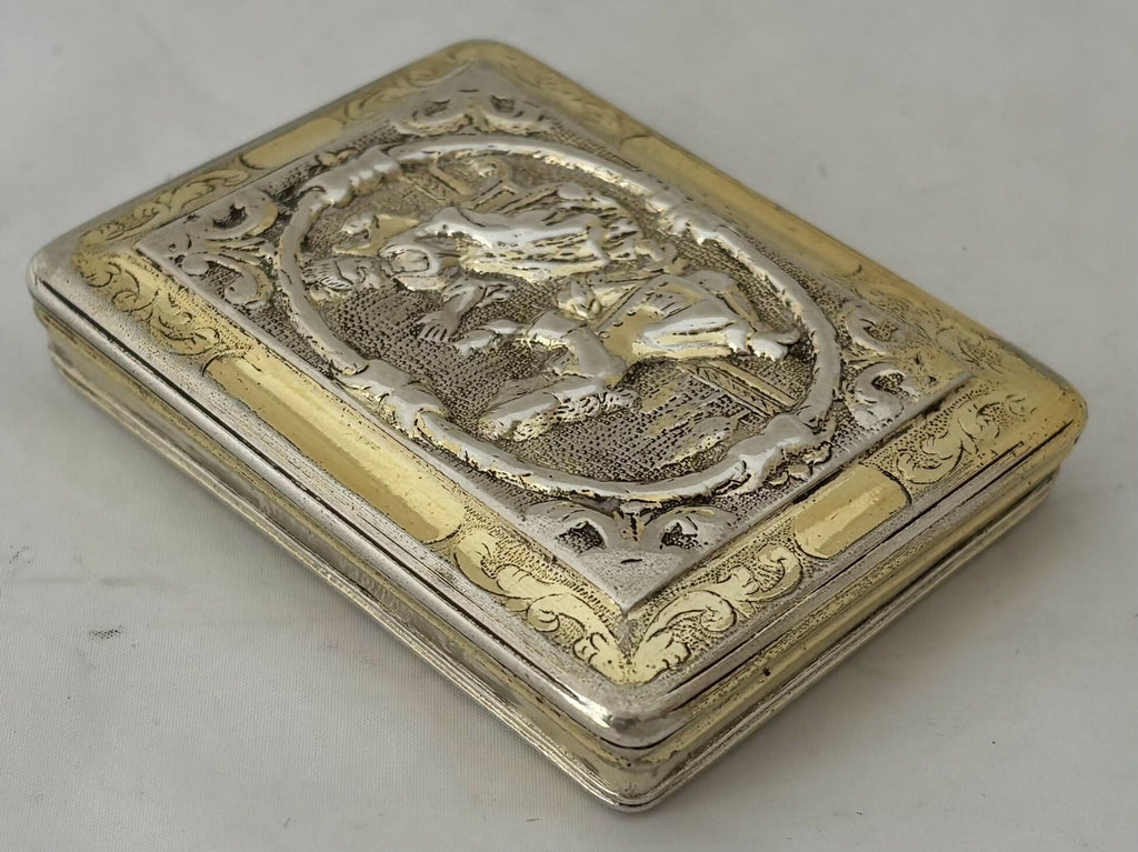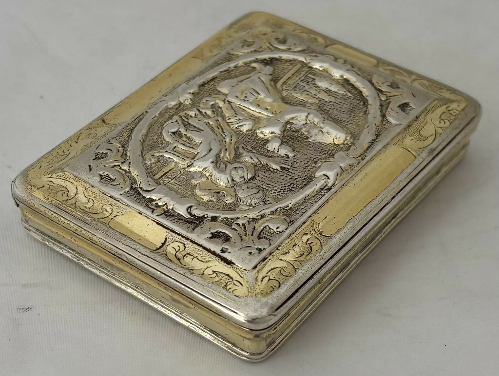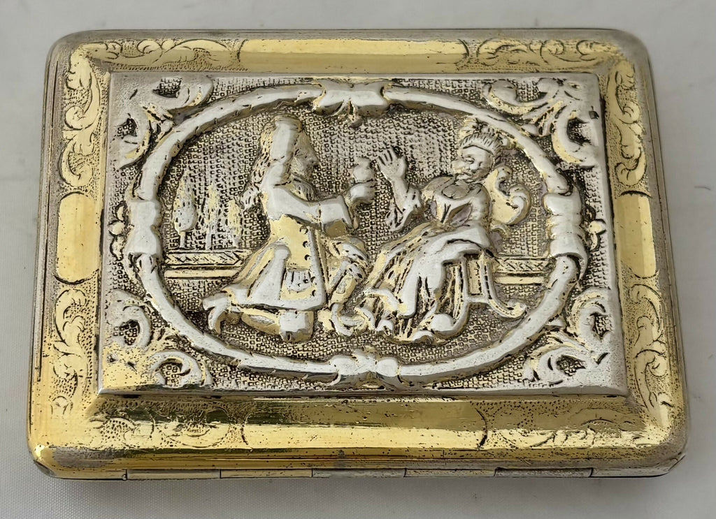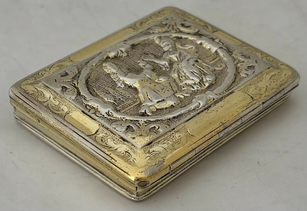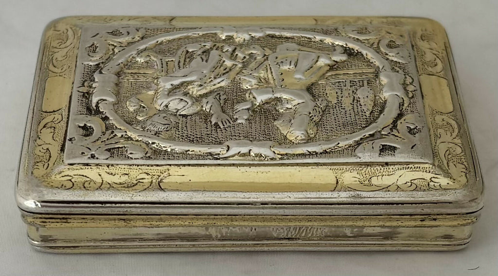 An Early George II Silver Gilt Snuff Box. The Cover With a Cast Panel of a Man Kneeling Before a Woman in a Chair Presenting her with a Vase, Within an Oval Cartouche Edged with Foliate Scrolls. Flat Chased Scroll Cavetto Edge. The Underside Engraved with Strap Work Scrolls.