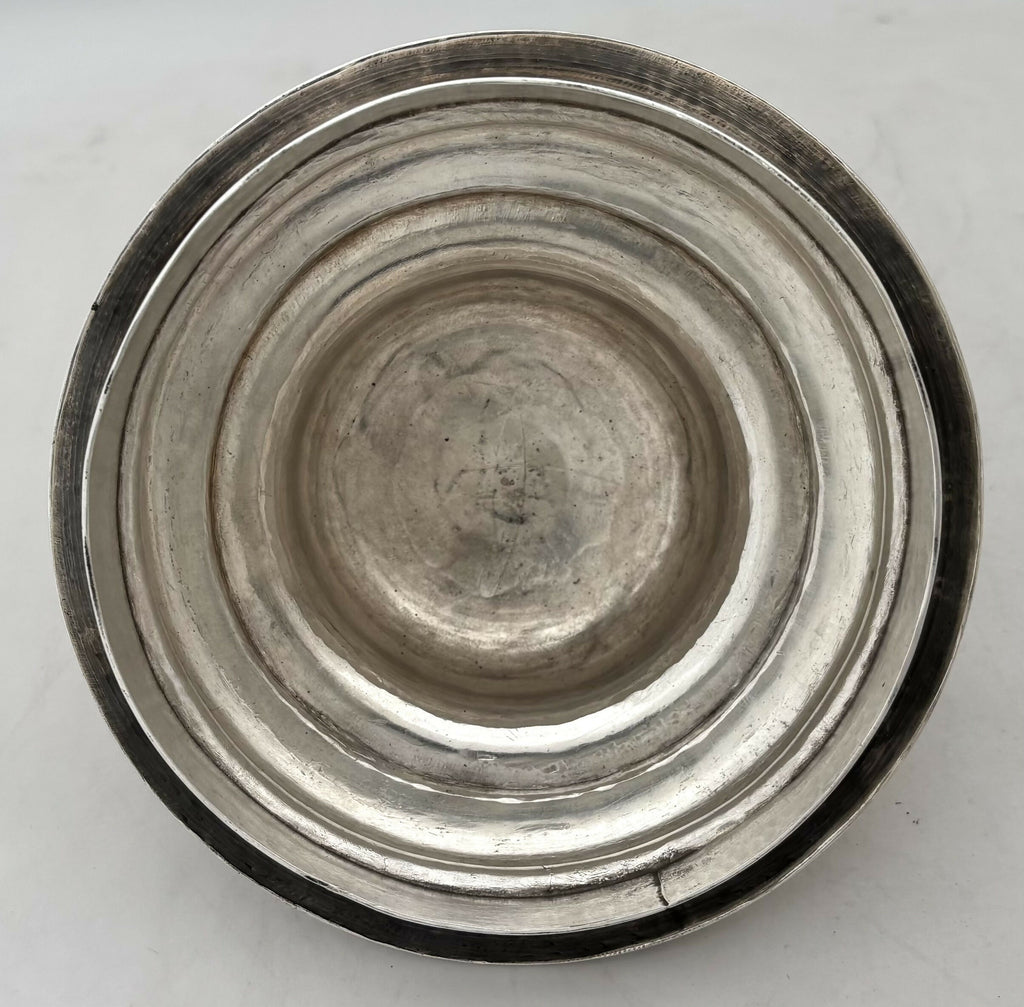 In good condition with some clouding (fire staining) of the silver. The turned cover finial with a hole at the side. Free of dents and creases. Solder marks to the underside of the base, but probably from construction. Age related surface wear.