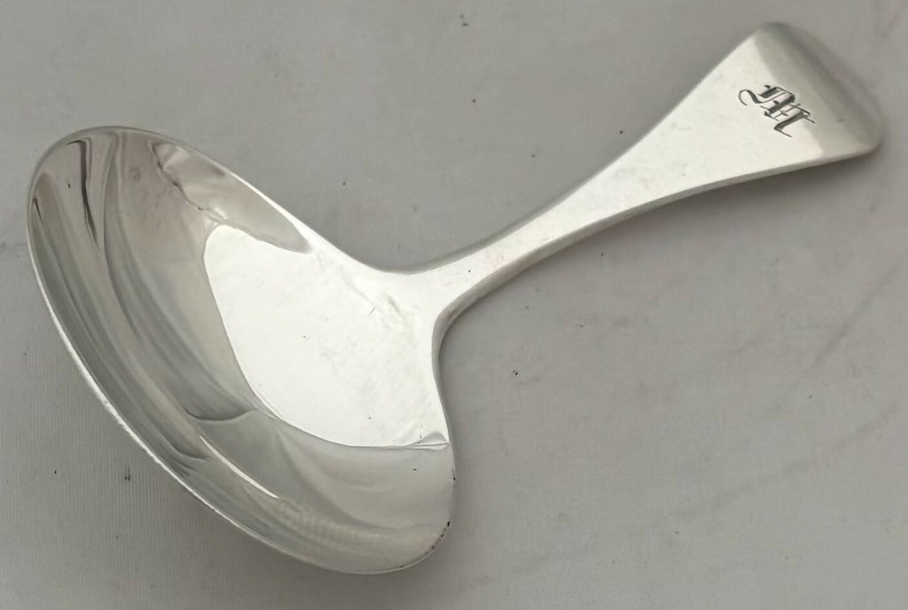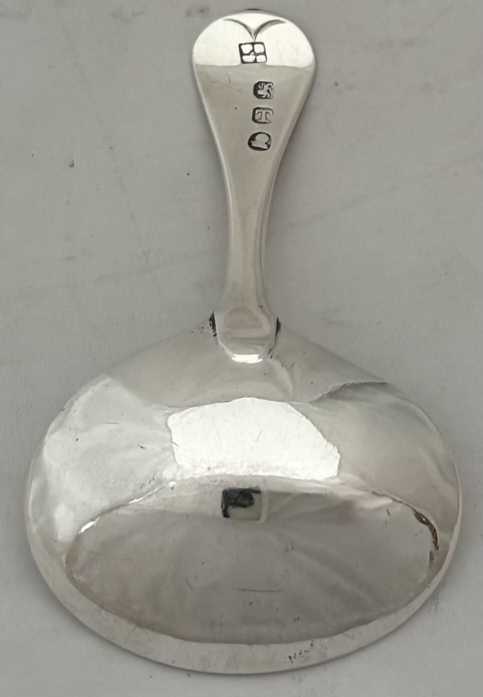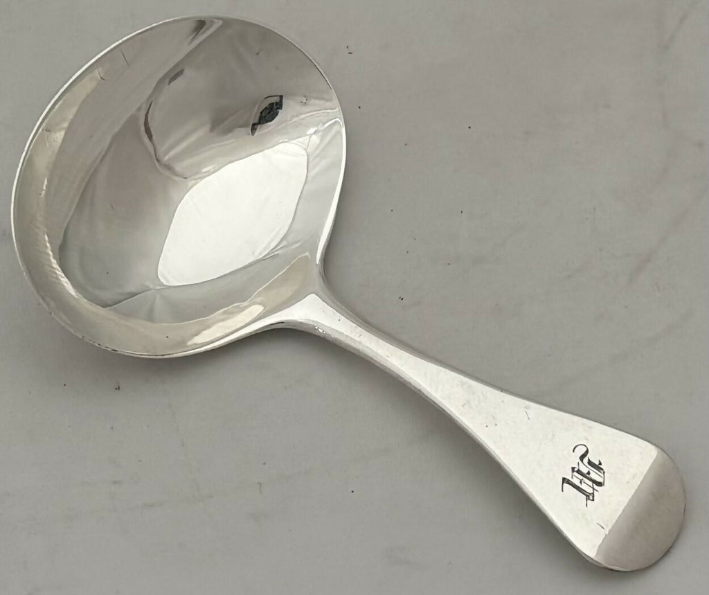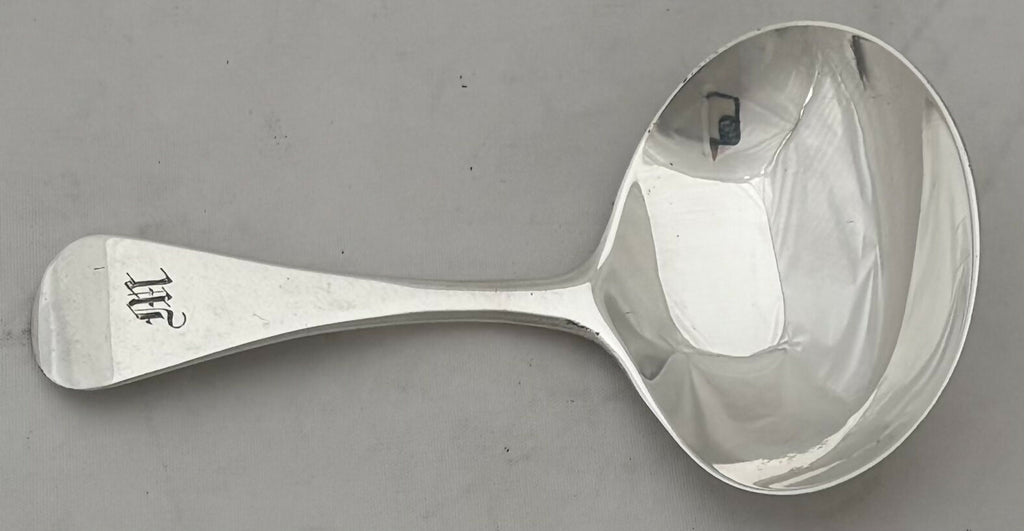 George III Silver Caddy Spoon. Of Old English pattern form with the initial M in gothic script to the terminal.