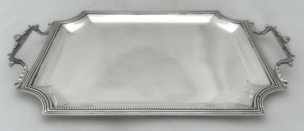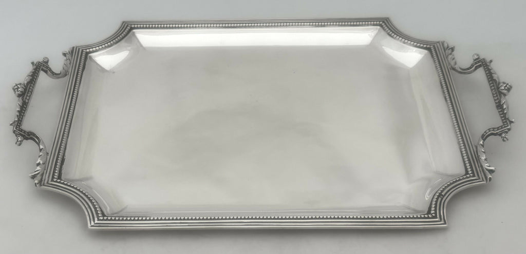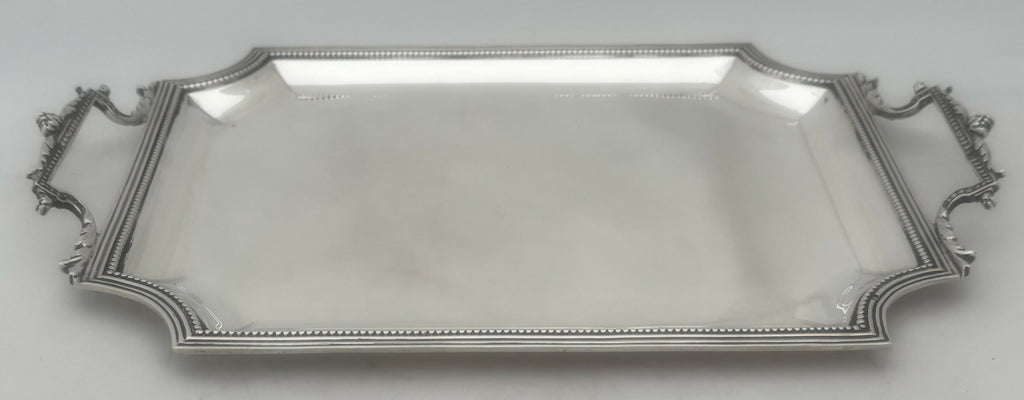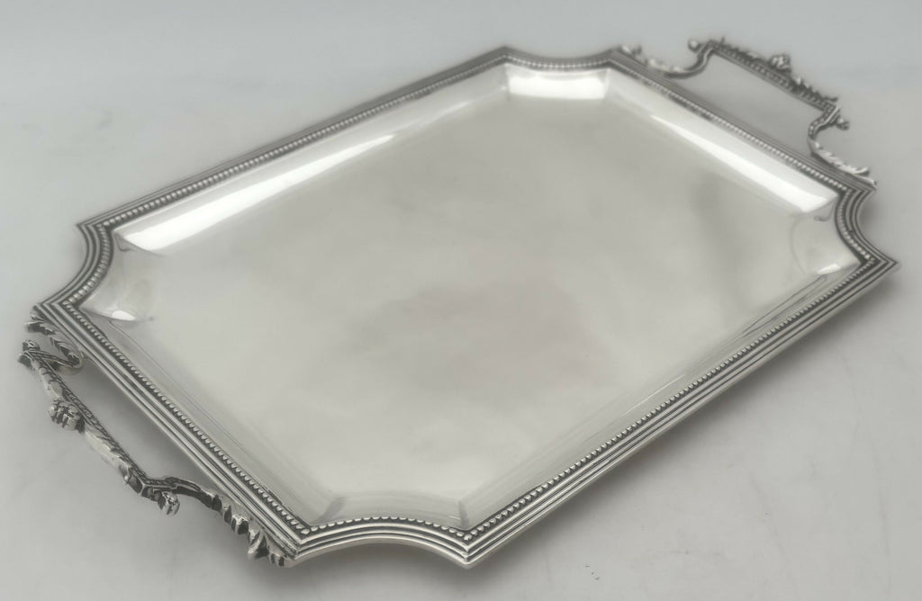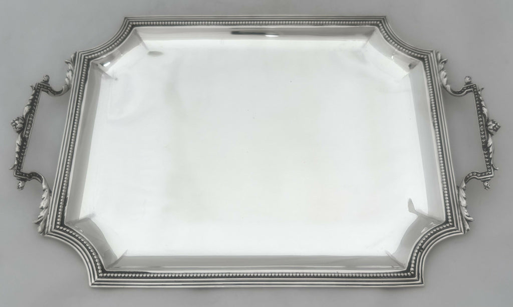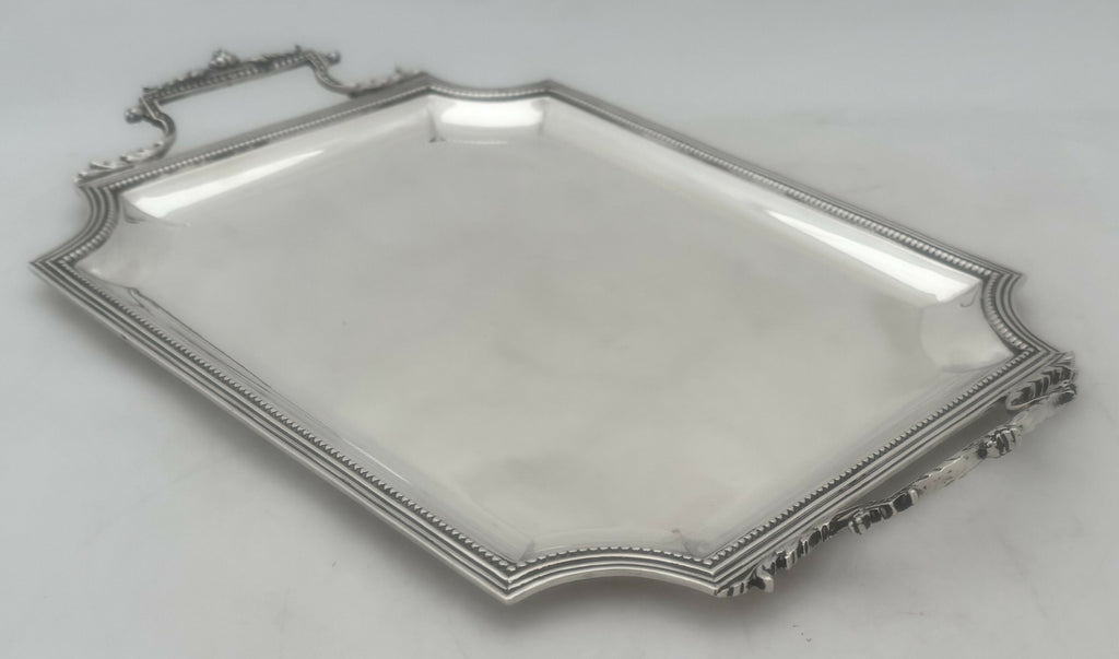 A French Silver Tray, Oblong, Canted Corners, with a Reeded & Beaded Border and two Foliate Capped Handles. Free of any inscription or engraving.