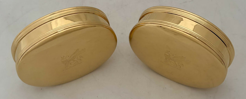 A Pair of George I Style Silver Gilt, Britannia Standard, Crested Oval Tobacco Boxes. Of oval form with reeded detail and free of any inscriptions.