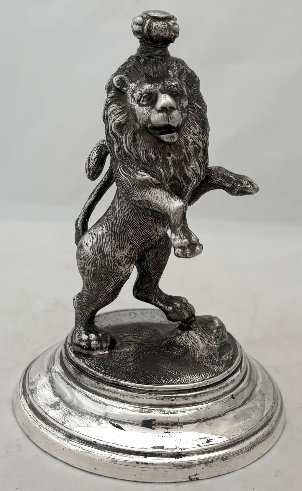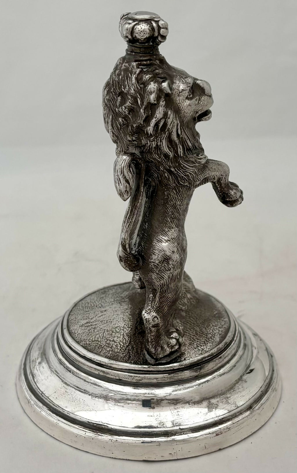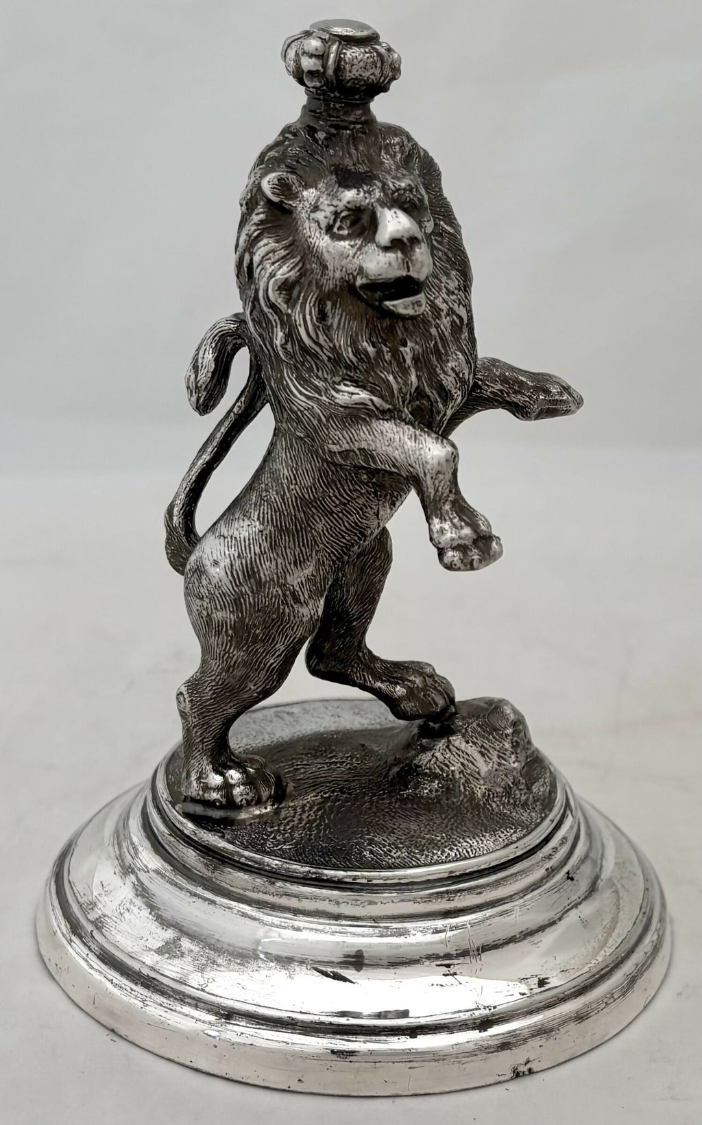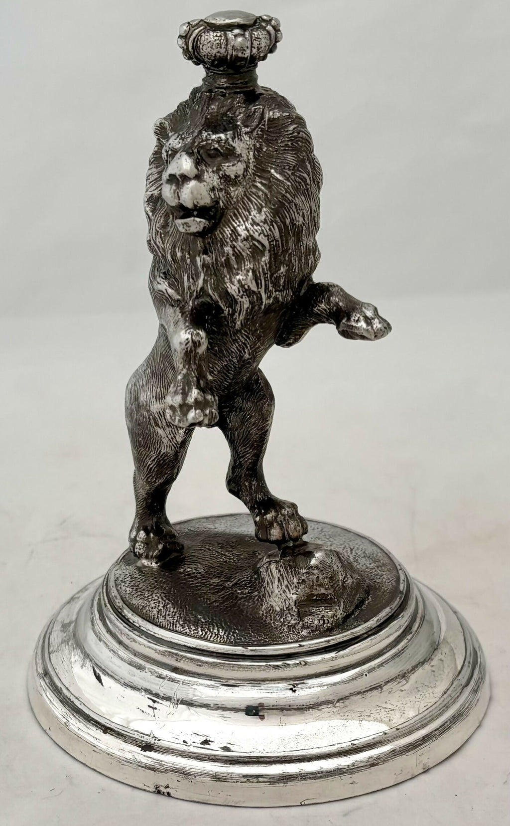 A Silver Plated Tudor Crowned Lion Rampant Desk Weight. Raised on a stepped circular base.