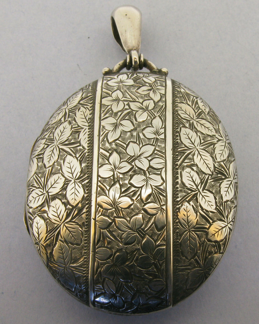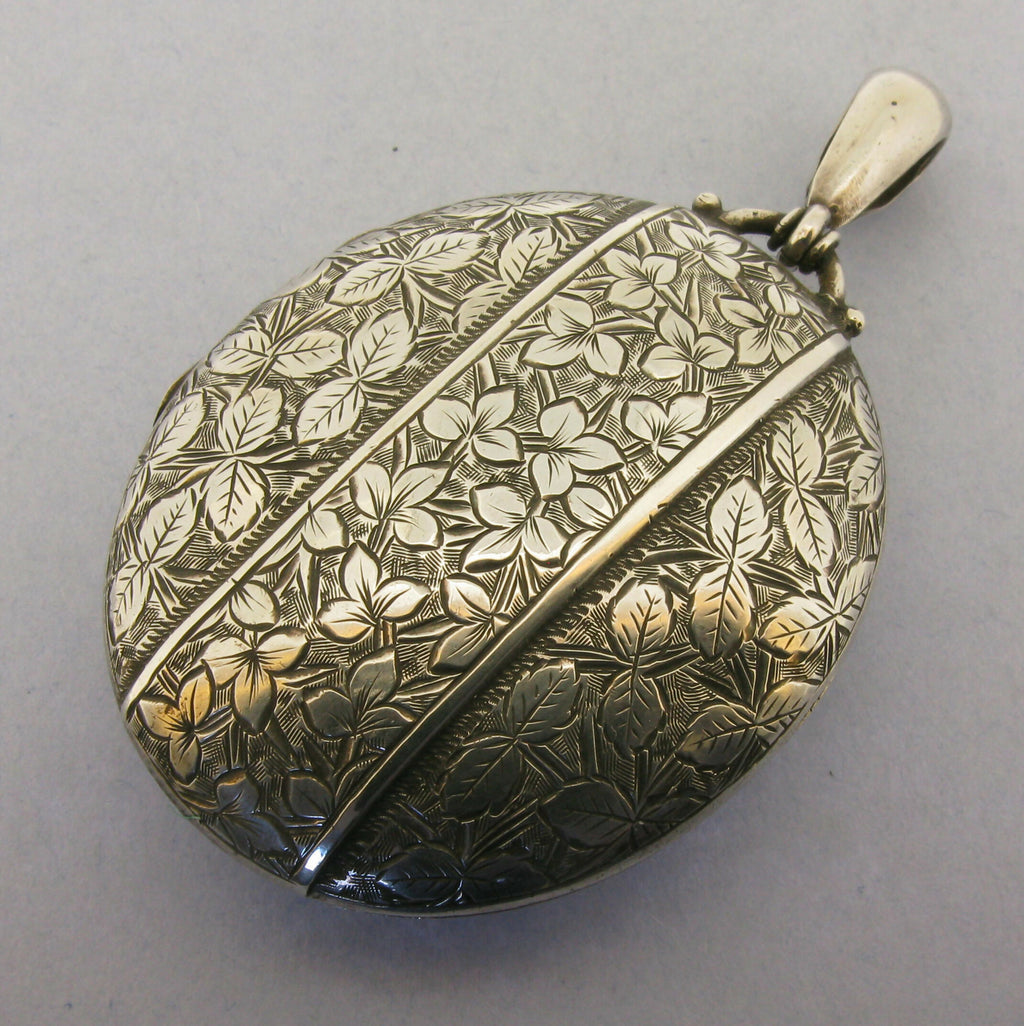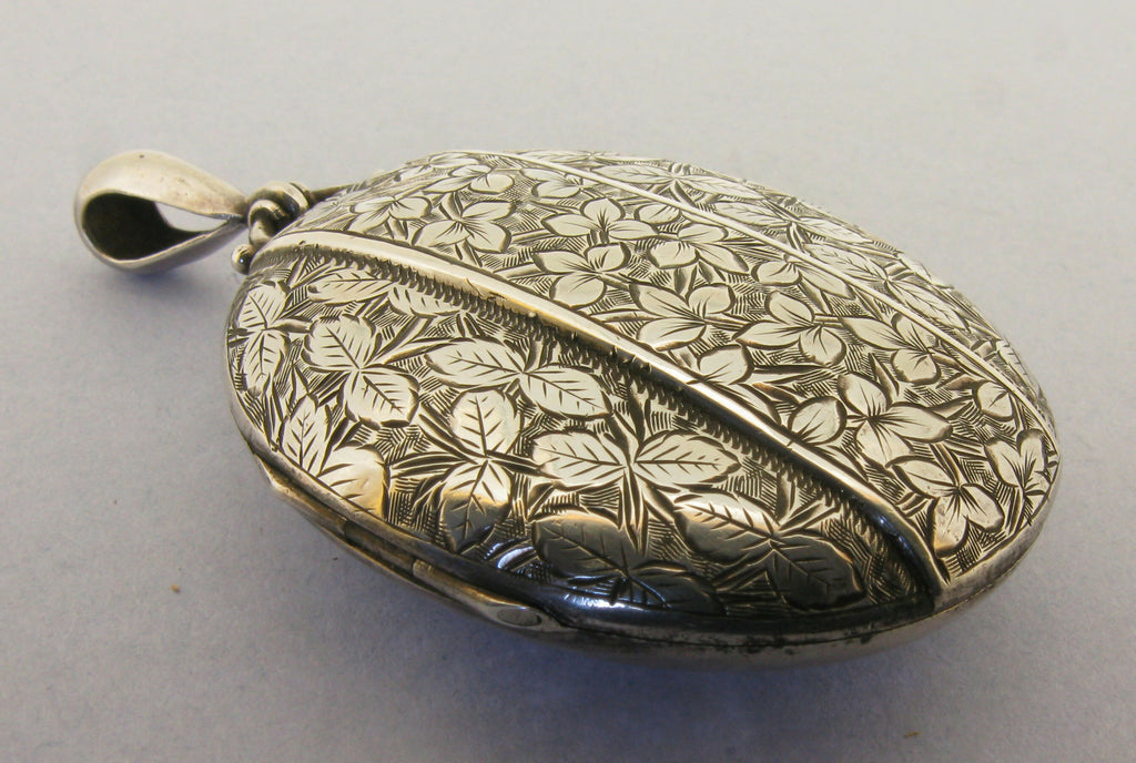 A Victorian Asthetic Movemrnt fine quality English sterling silver hinged picture locket pendant. It is decorated to the front with fine engraving. Inside the locket the original retaining rims are present, one original glass is still present.. To the reverse of the locket we have a full sterling silver hallmark for Birmingham 1881