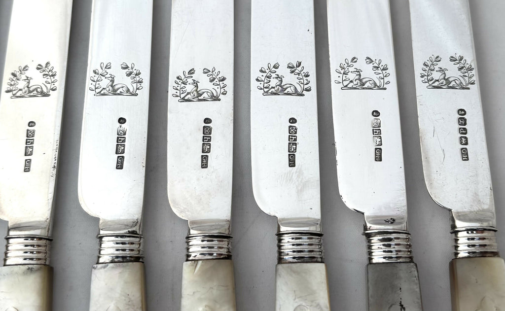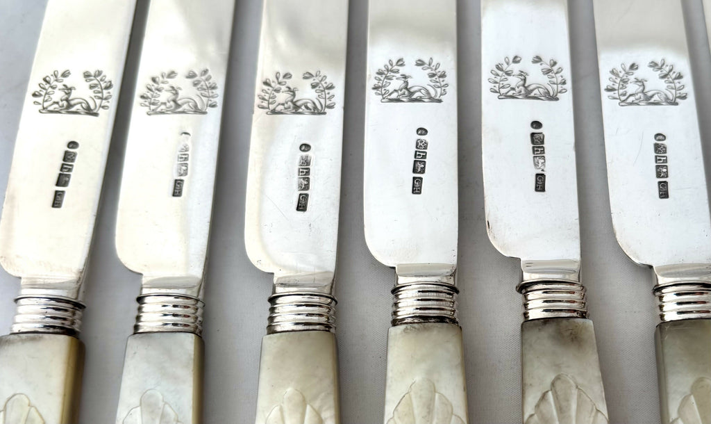Twelve forks and Eleven Knives are hallmarked for Sheffield 1831. One knife is hallmarked for Sheffield 1827. All pieces are marked for George Hardisty and have an identical crest.