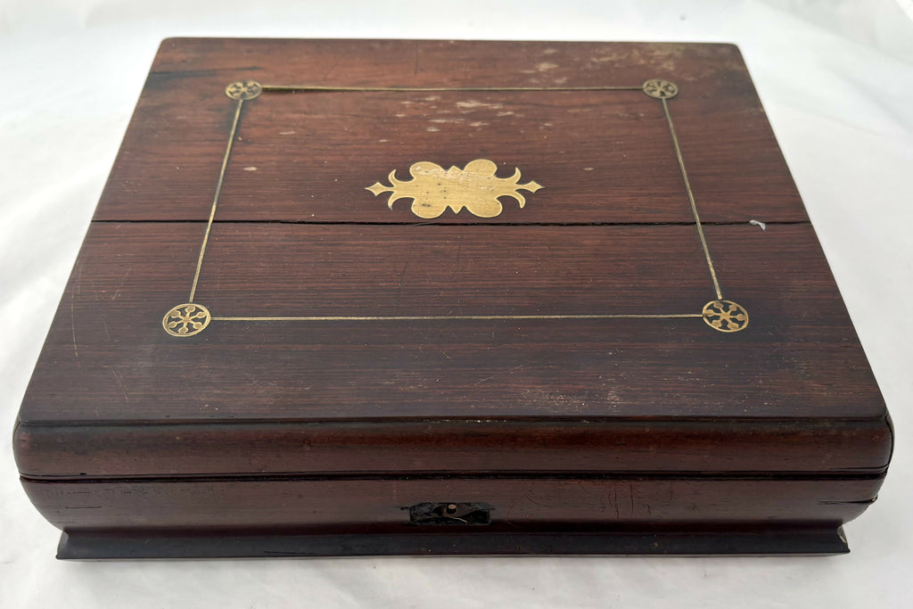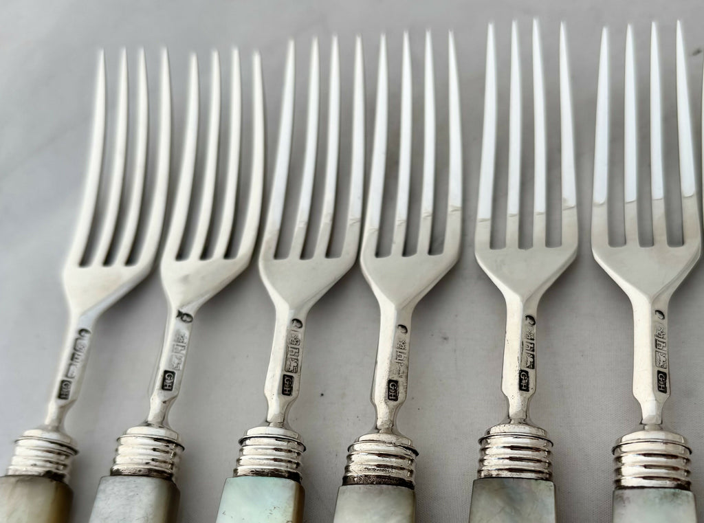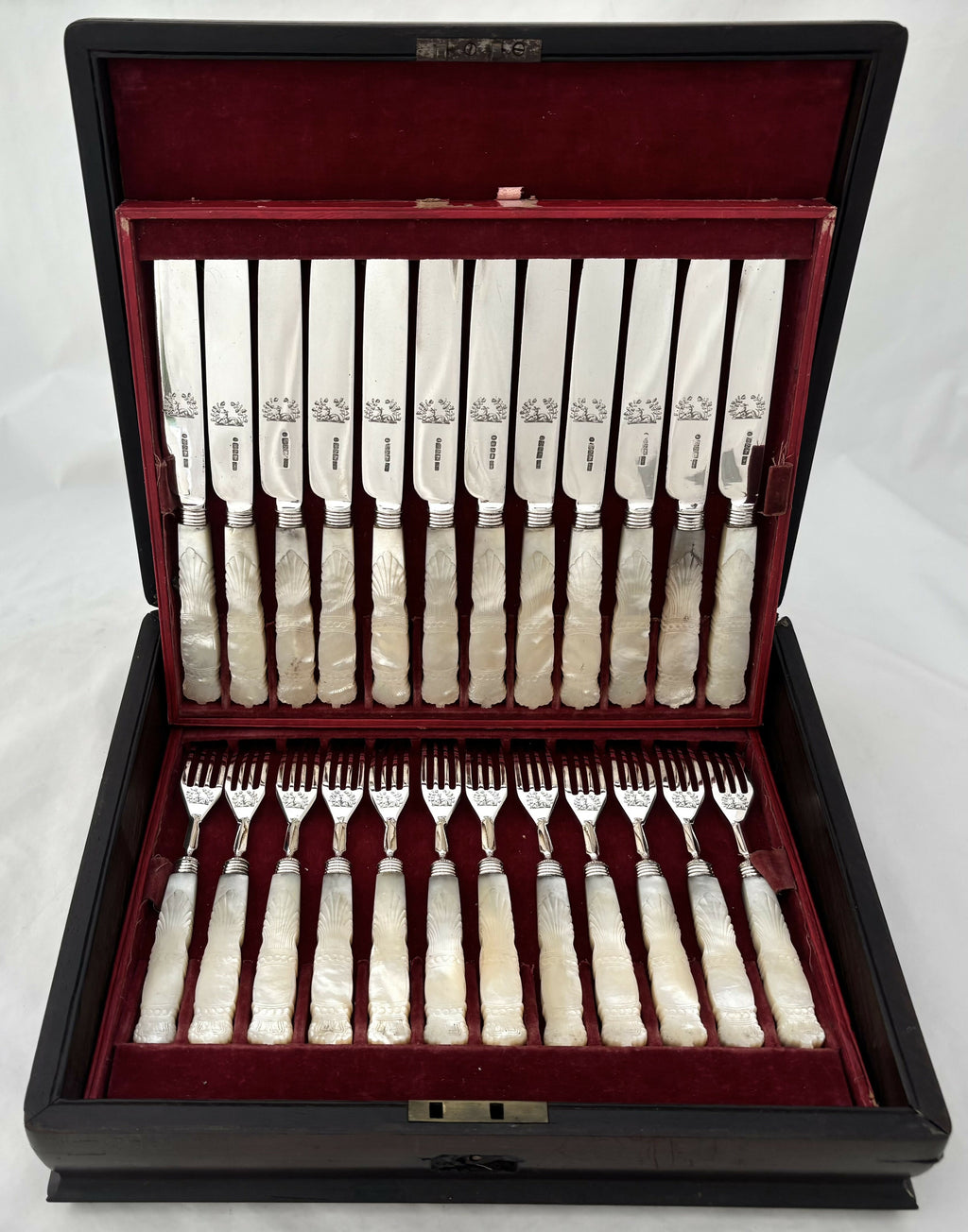 The knives and forks are in very good order with tines and blades ready to use. The carved mother of pearl is without losses, or repair, but does have some age related wear. The handles are all tight and ready to use. The case has a split across the cover and a slight gap in one corner where the side has slightly moved away from the rear. The case does not have a key.
