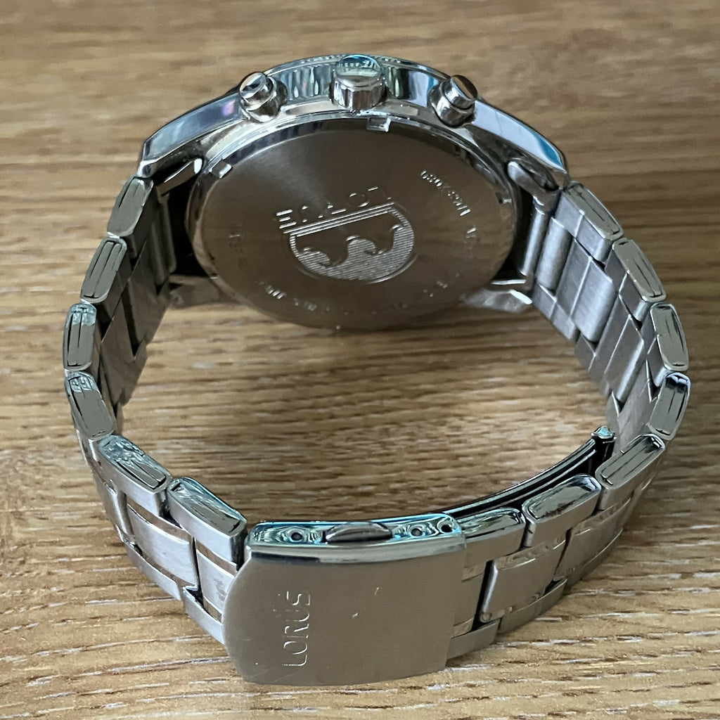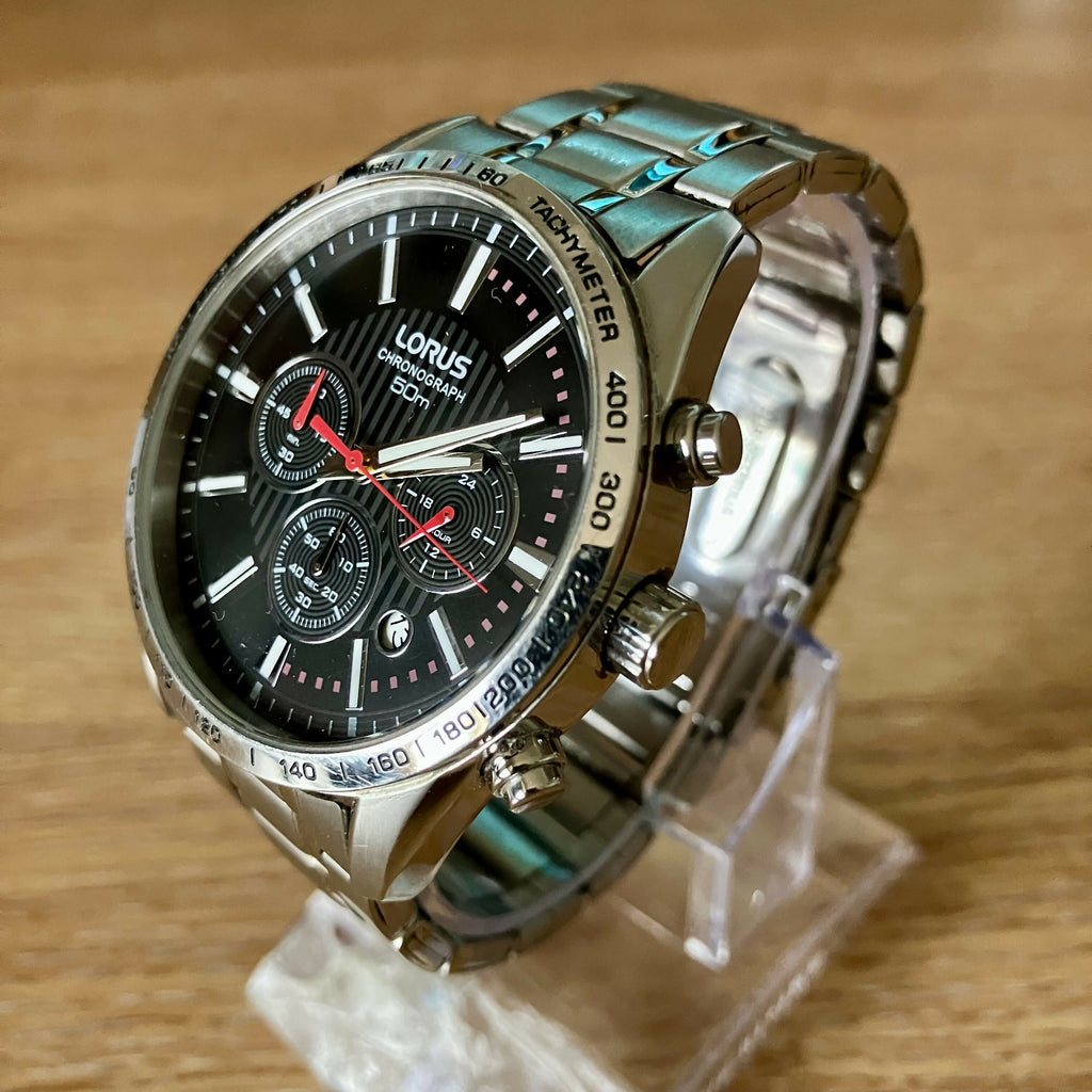Sporty men’s Lorus chronograph powered by a Seiko VD53 quartz movement, featuring tachymeter bezel, date display, and multi-register chronograph layout.