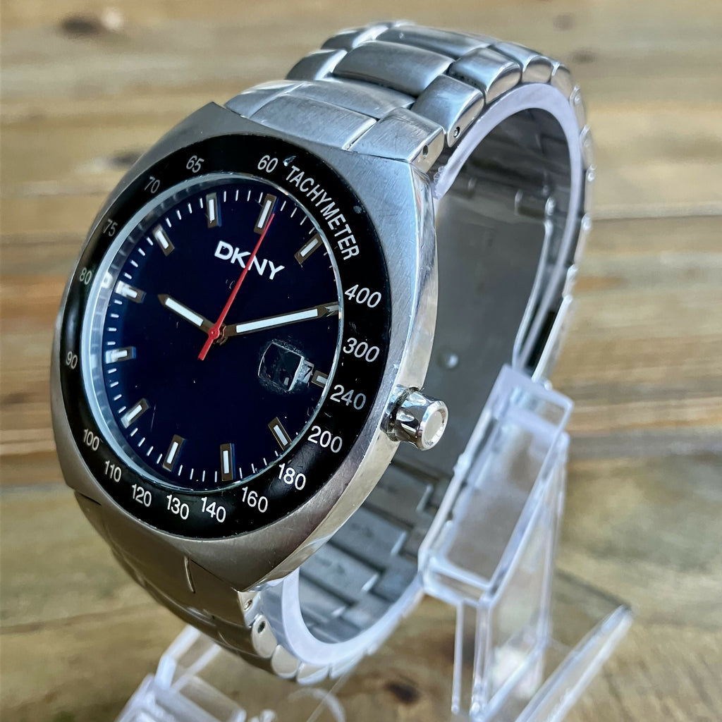 DKNY NY-5062 men’s stainless steel watch featuring a striking sunburst blue dial, red seconds hand, tachymeter bezel, and magnified date window. Powered by a reliable quartz movement and housed in a solid 40mm steel case with 5ATM water resistance. A stylish, sporty everyday watch in good working condition.