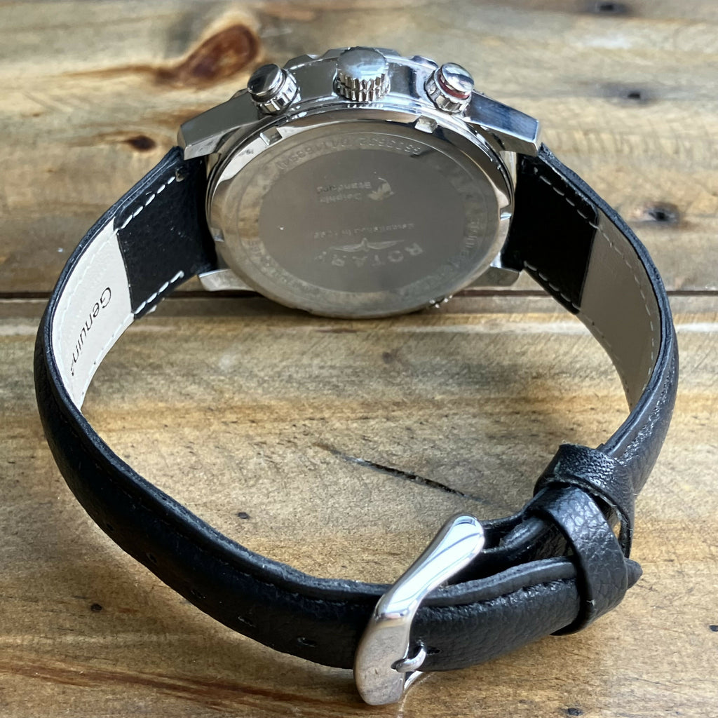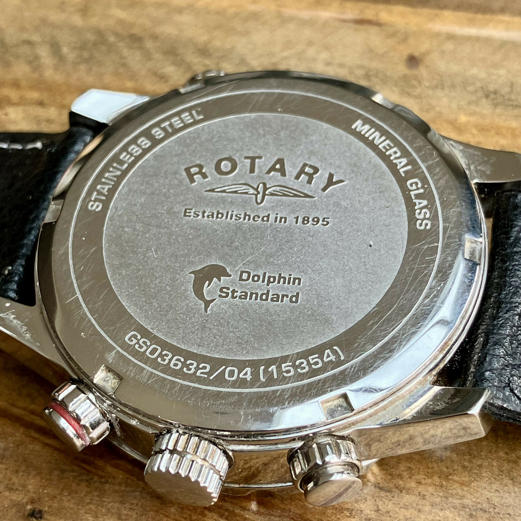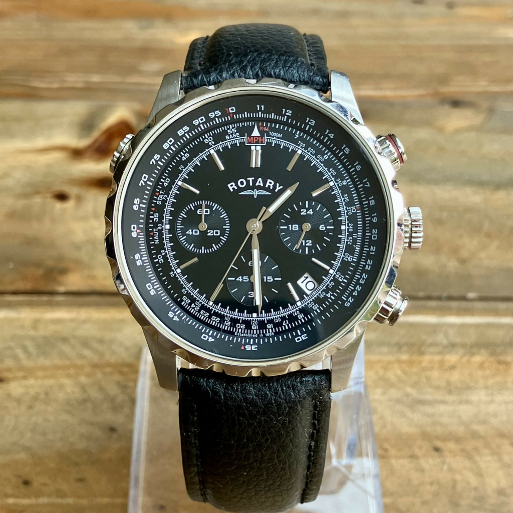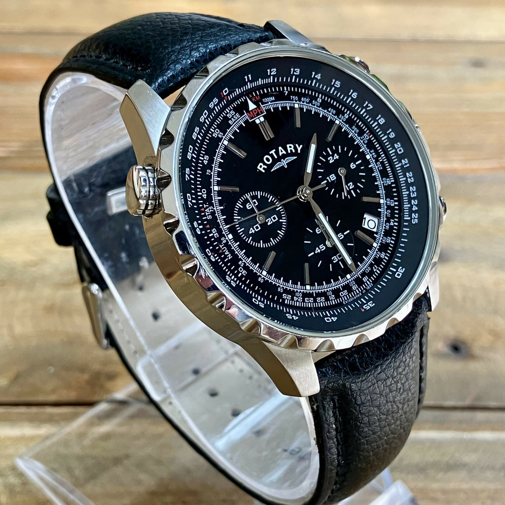 High-impact, modern chronograph by Rotary: GS03632/04 features a striking black dial with three sub-dials, housed in a robust 42-43 mm stainless steel case and fitted with a comfy leather strap.