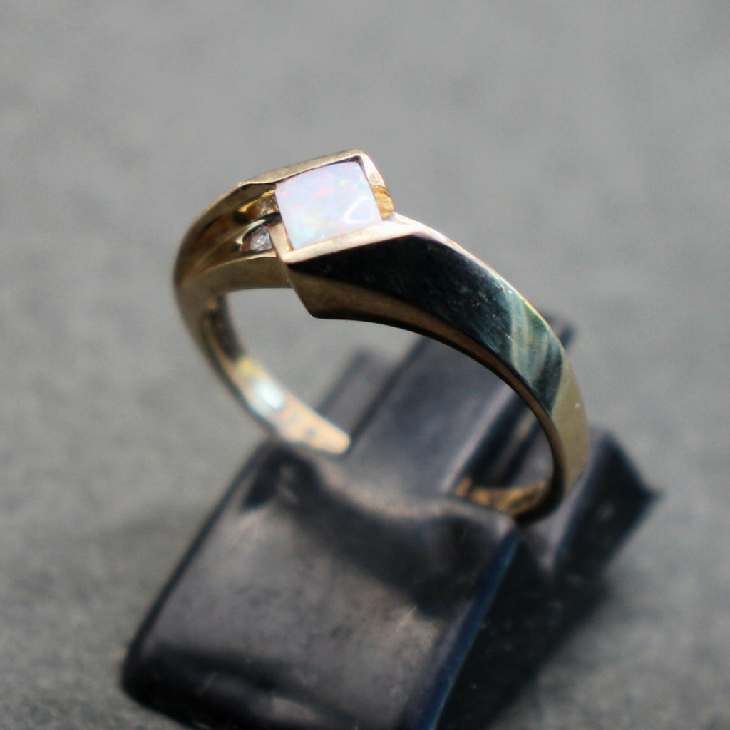This 10ct gold ring is set with a central square cut opal, measuring approximately 4x4mm, flanked by small diamond chips set into the shoulders, one each side.