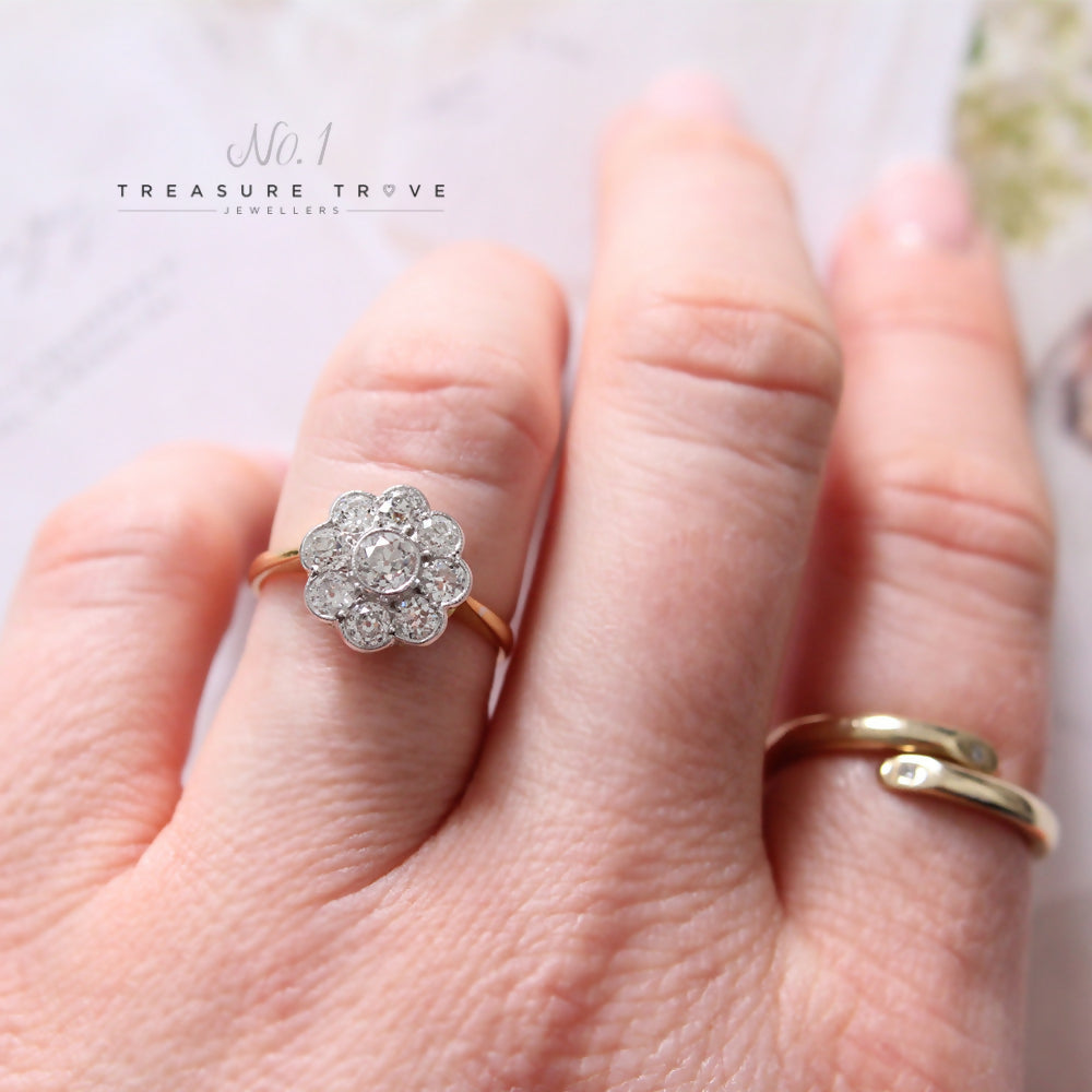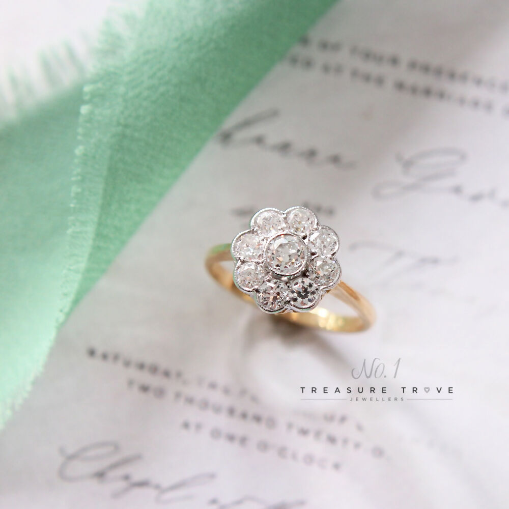 Stunning diamond daisy cluster ring set with a central old cut diamond surrounded by eight old cut diamonds. Total diamond content 1.20cts (stamped inside shank). Colour estimated as J. Clarity estimated as SI. Mounted in 18ct yellow gold with white gold rub over settings with millegrain edgings. The cluster measures 11.75mm in diameter. The shank is stamped 18CT and has been tested to confirm. Finger size N. PLEASE NOTE: This item is not in the centre.