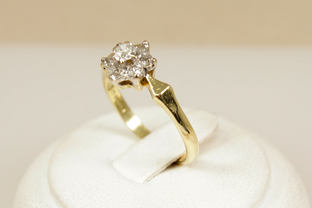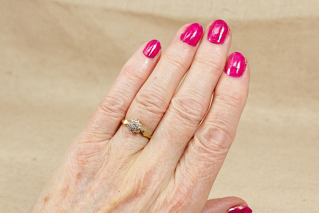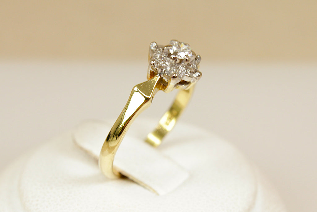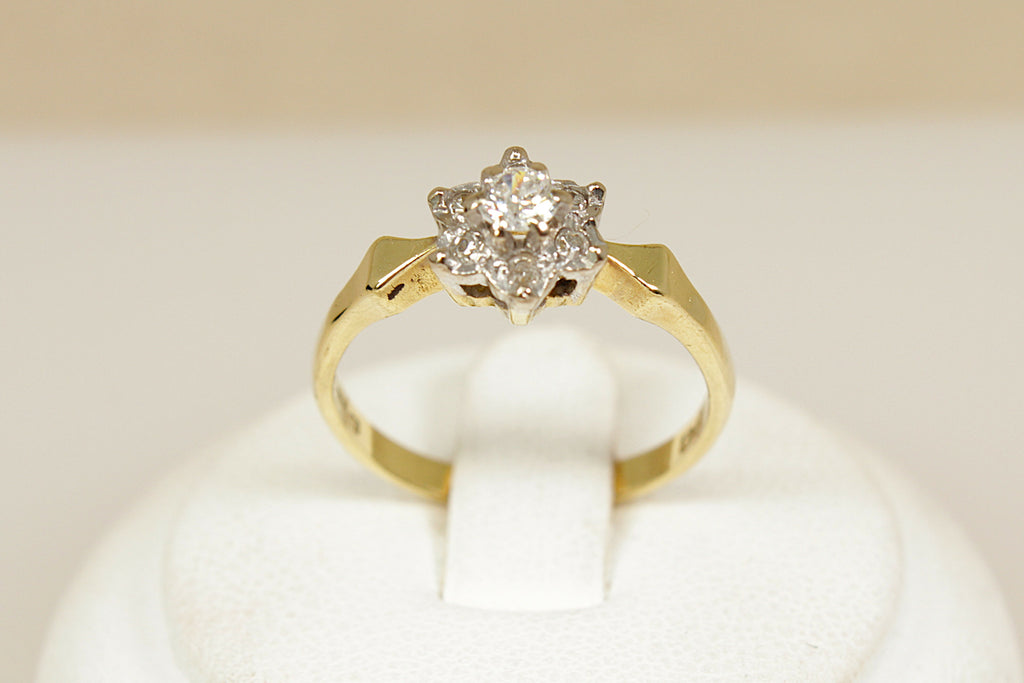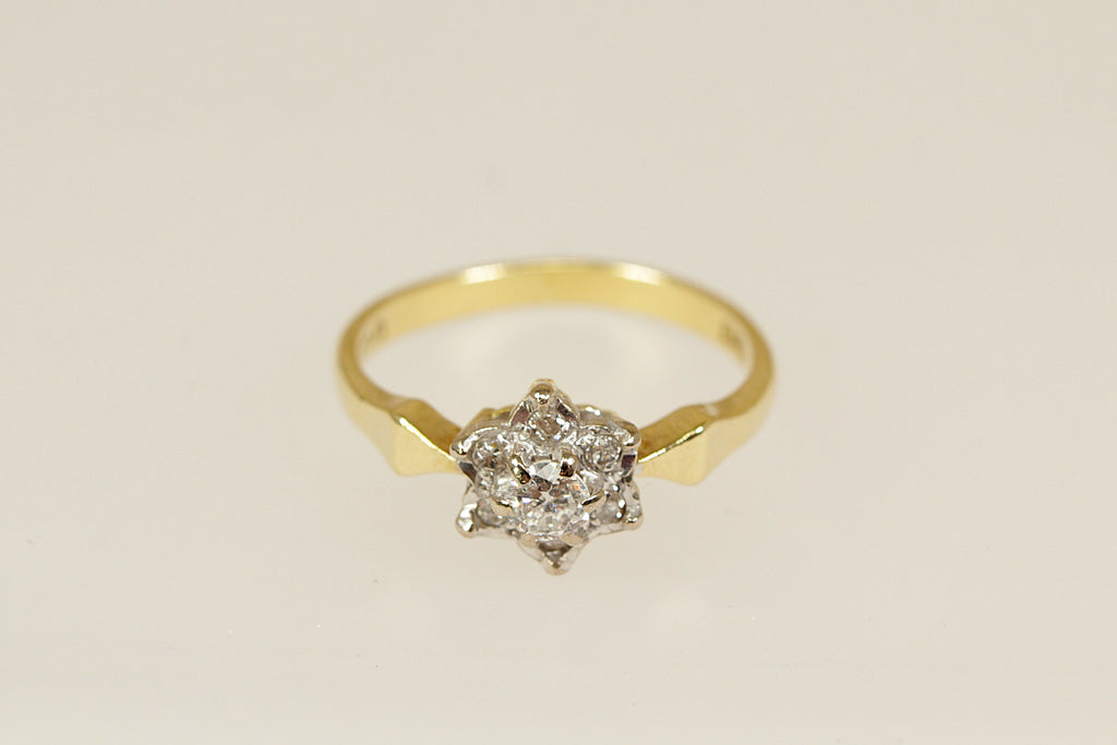 This charming vintage 18ct Gold ring features a classic ‘Daisy’ cluster design. At its centre sits a bright 0.20ct round Diamond, surrounded by six smaller round diamonds that form a delicate floral motif, giving the ring a total estimated diamond weight of approximately 0.25ct.