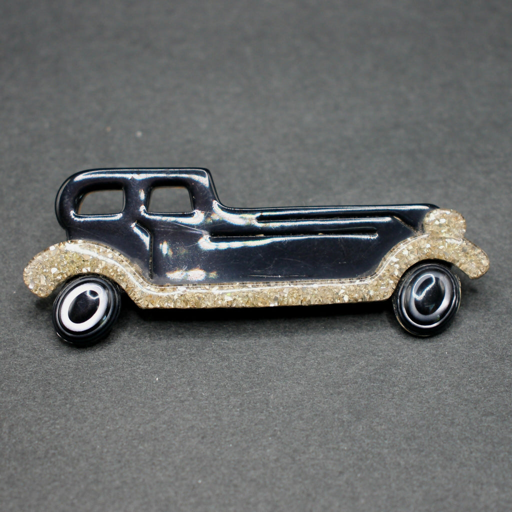 Original Lea Stein limousine brooch measuring approximately 70mm wide by 26mm high. The brooch is moulded in shades of black and gold, and has the oval “in motion” wheels. The v-shaped brooch pin/mount is stamped “Lea Stein” and “Paris”.