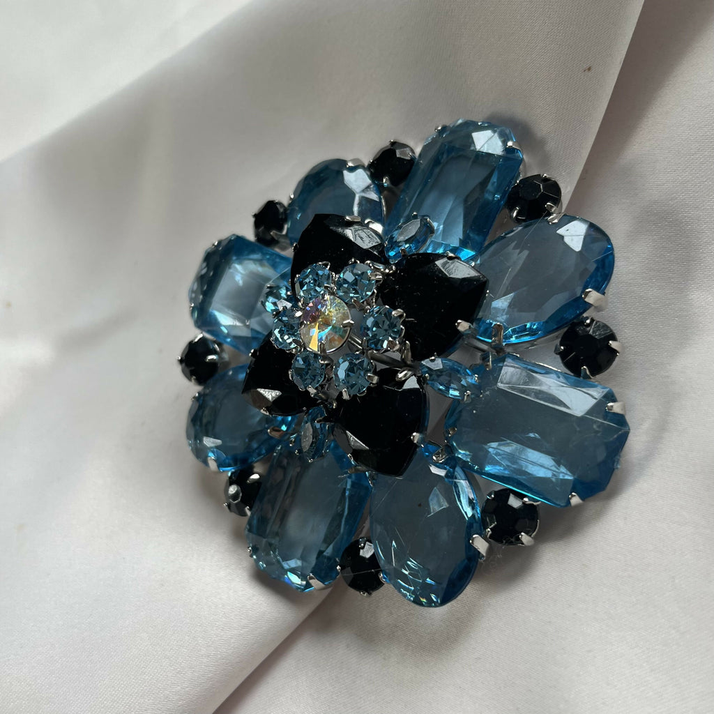Retro Blue and Black Glass Faceted Extra Large Brooch